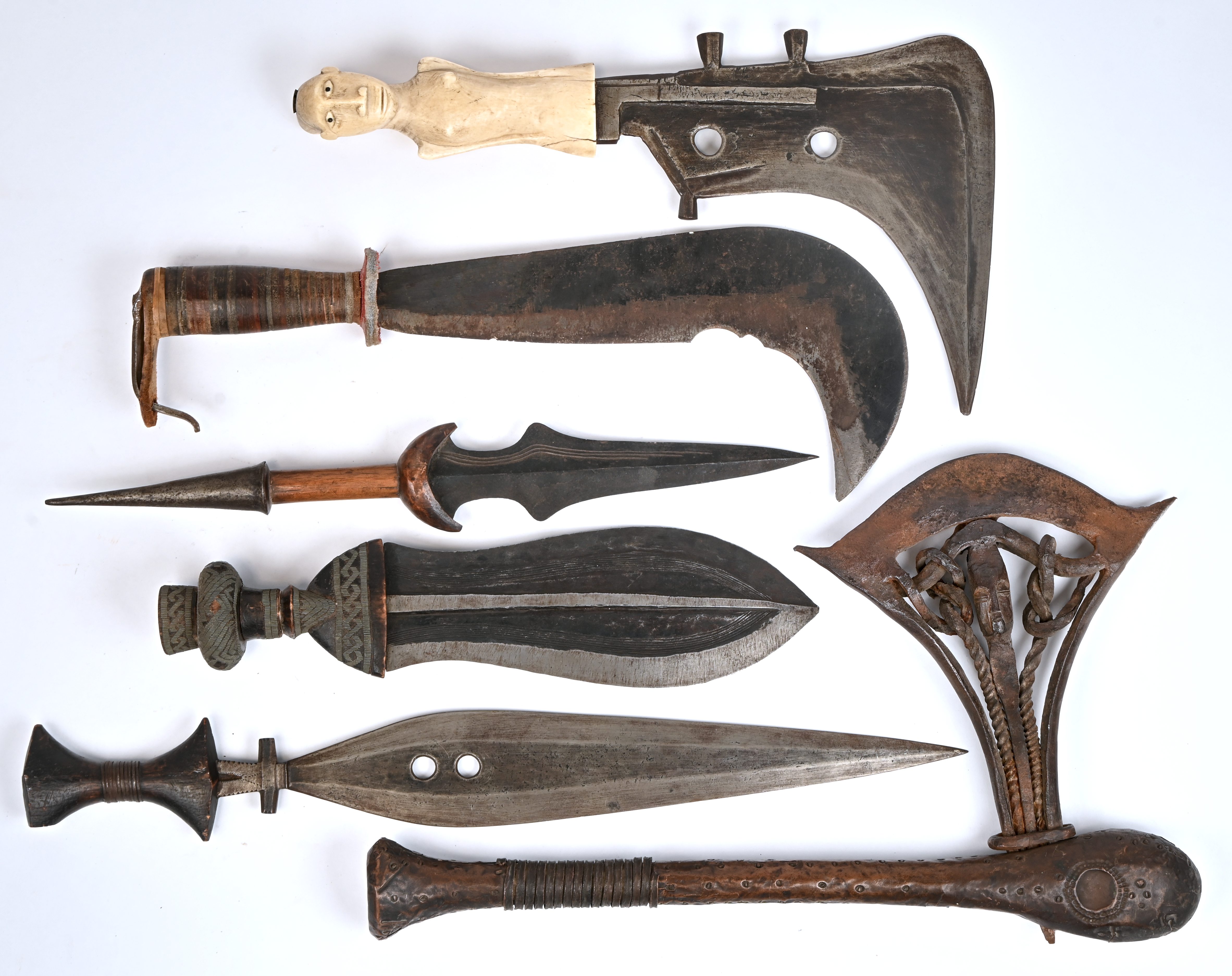 Een lot van 6 Afrikaanse wapens in diverse materialen, staal, koper, hout en been, bestaande uit een bijl, dolken/messen en slagwapens