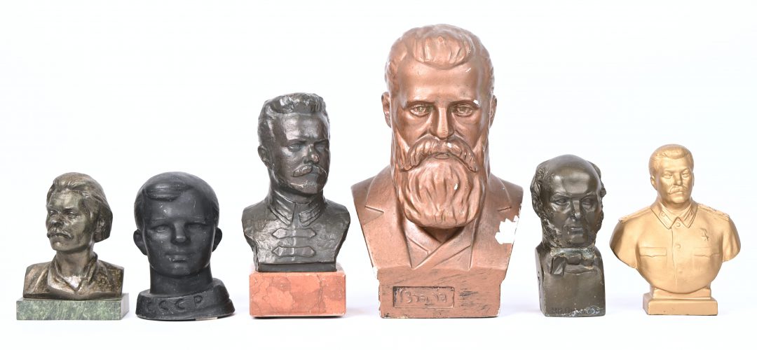 A lot of 6 busts in various materials depicting famous Russians, zinc alloy and plaster.