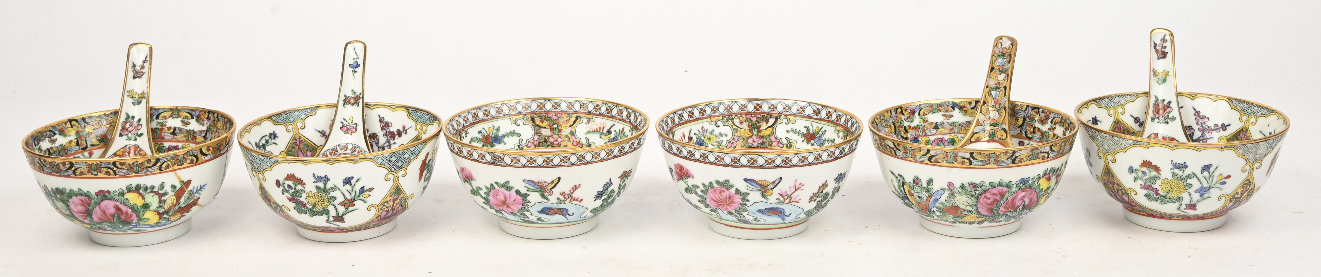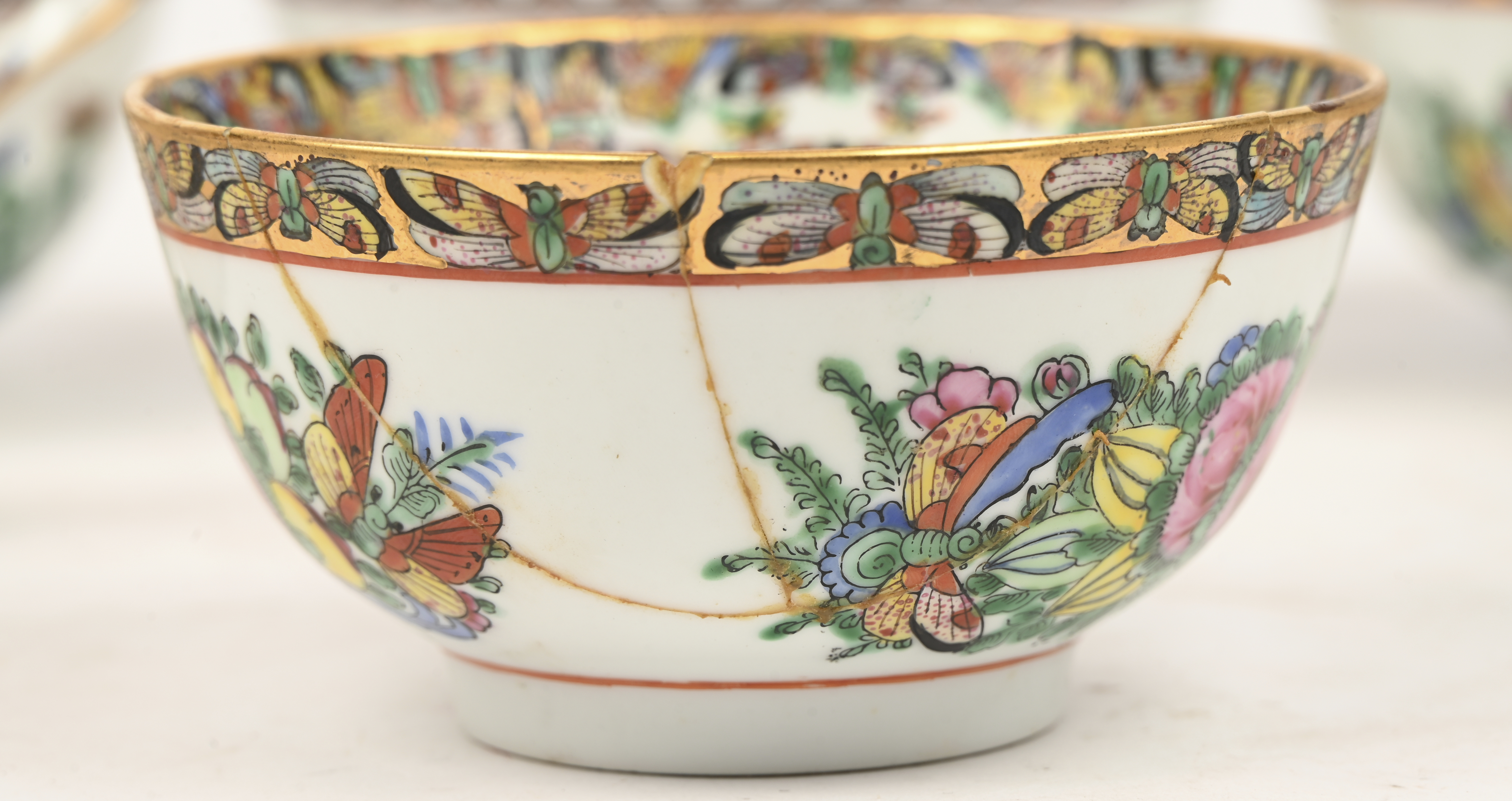 A decorative dish and three bowls of multi-colored Chinese porcelain, famille rose. Stamped. -