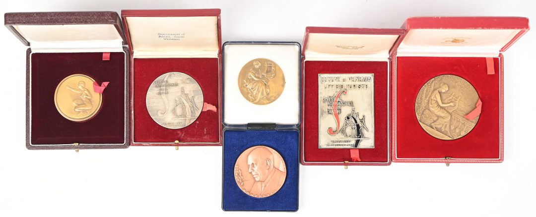 A lot of 6 medals and plaques with a musical theme, bronze and other metals: Tribute from the Association of the Music Press, Sabam, Oratorio of St John the Baptist, Robert Stolz, 1st festival internazionale della Canzone and 3rd festival internazionale della Canzone.