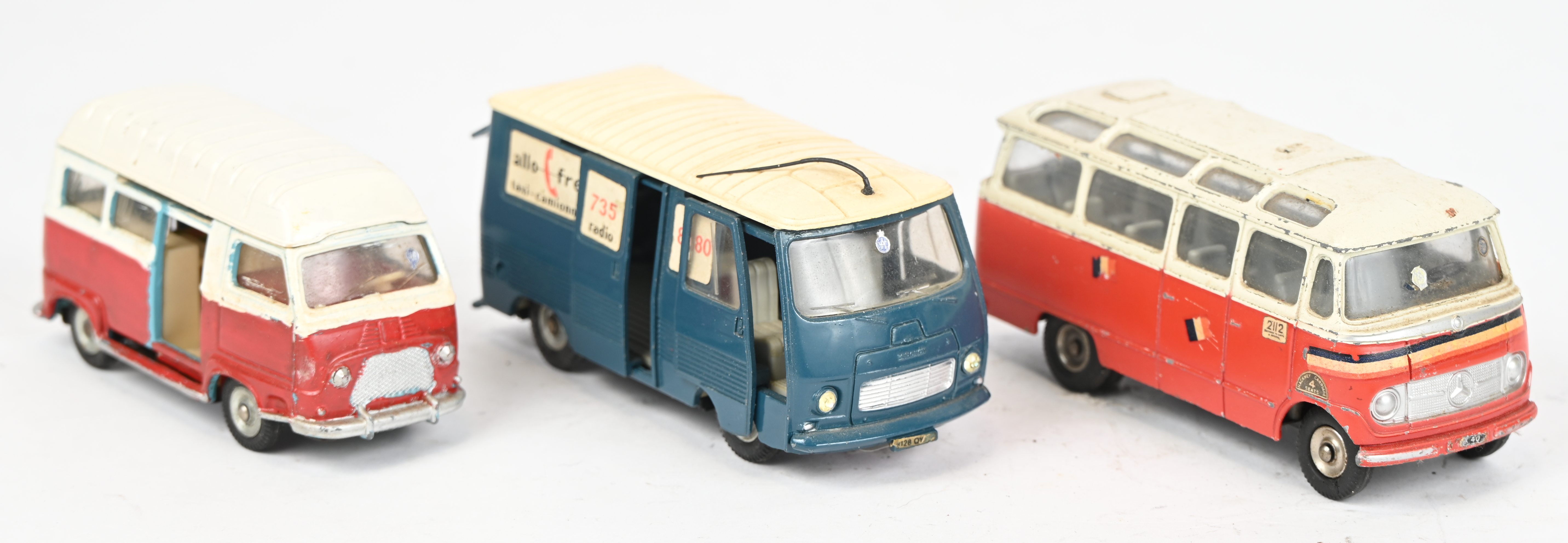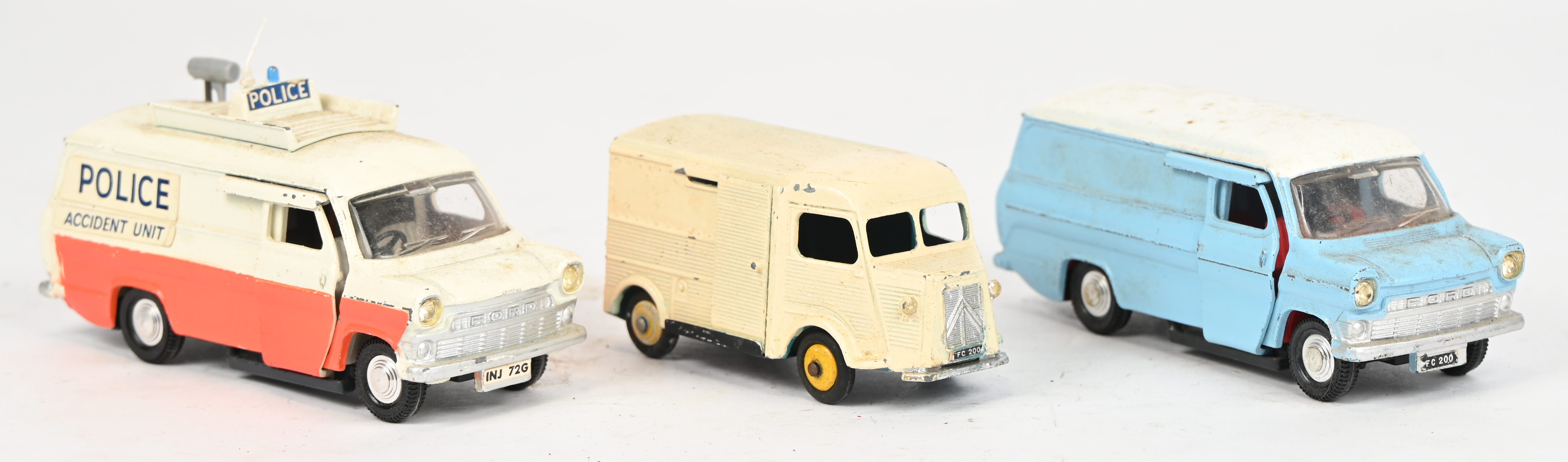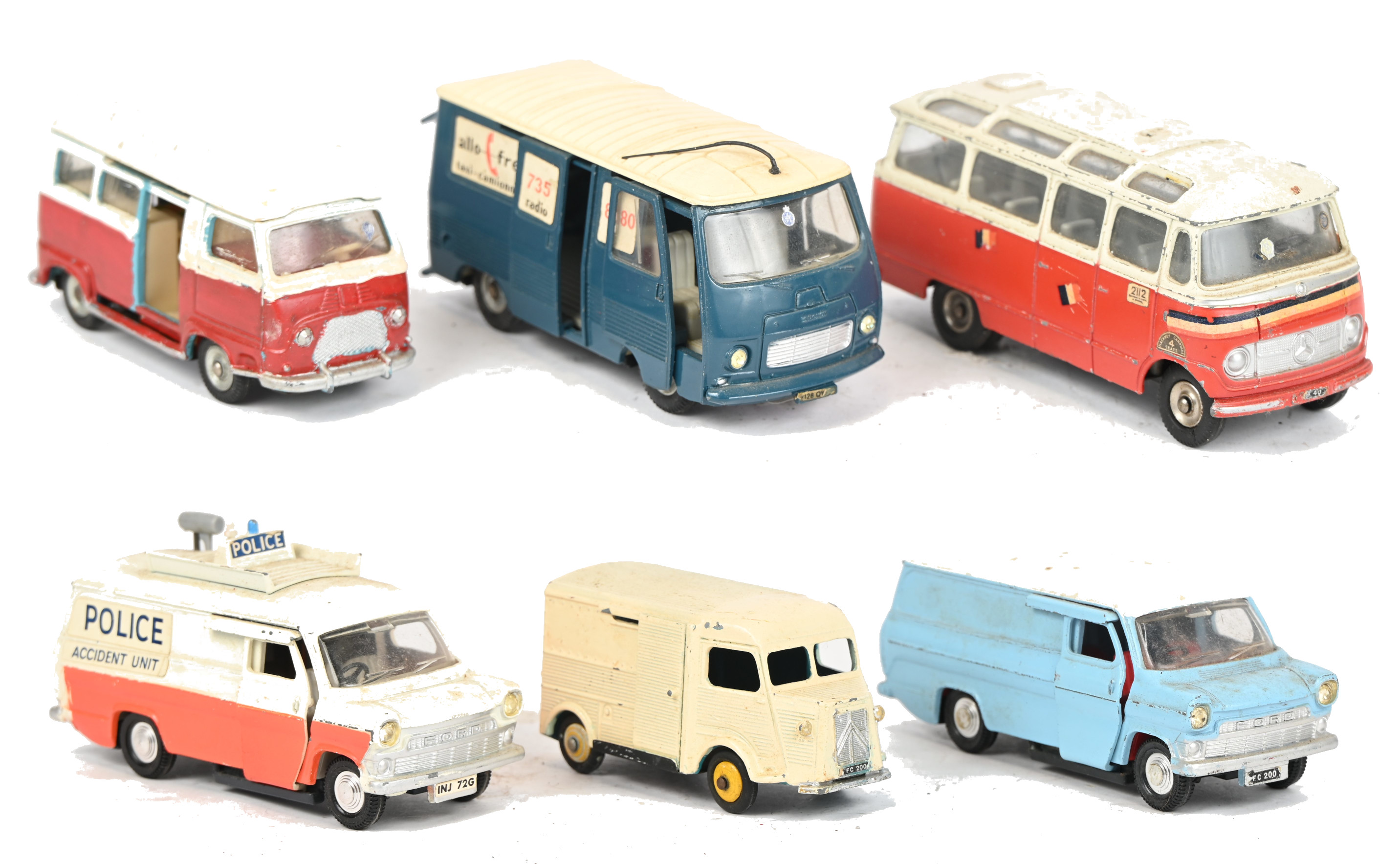 Een lot van 6 vintage die-cast camionnettes: Fourgon Peugeot J7, Car Mercedes Benz, Citroen 1200K, Renault Estafette, Ford Transit Van en Ford Transit Van Police accident unit.