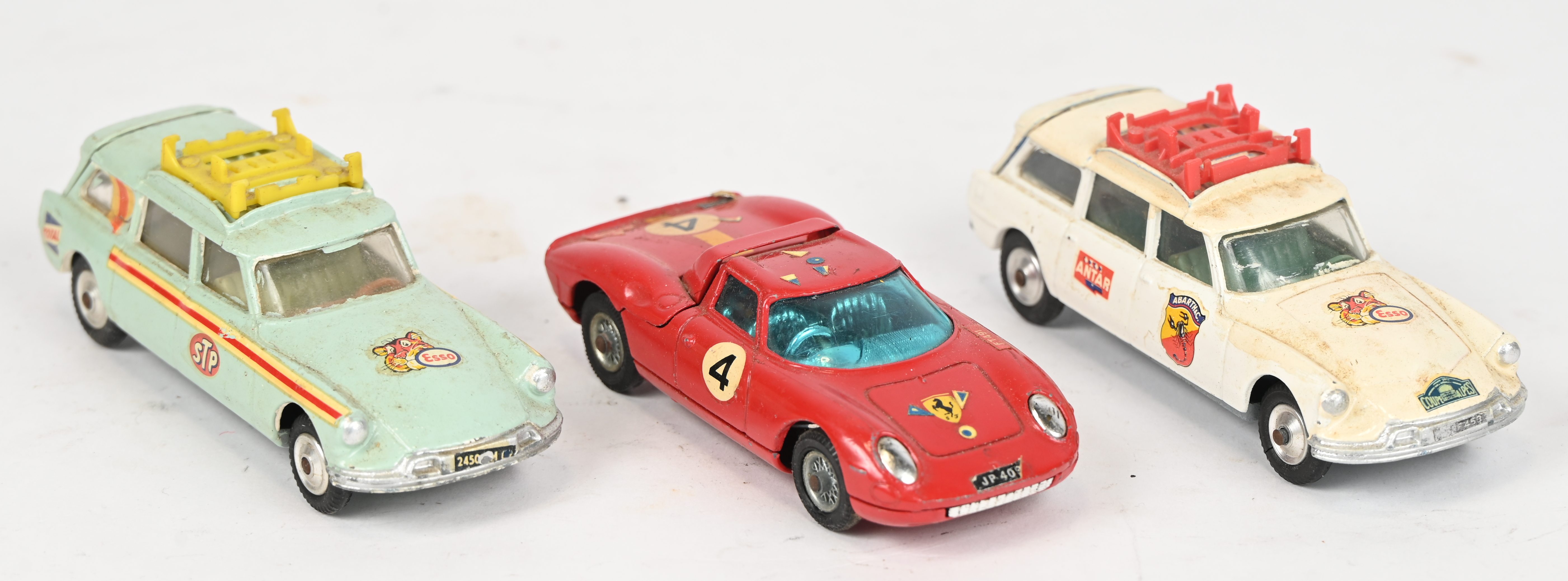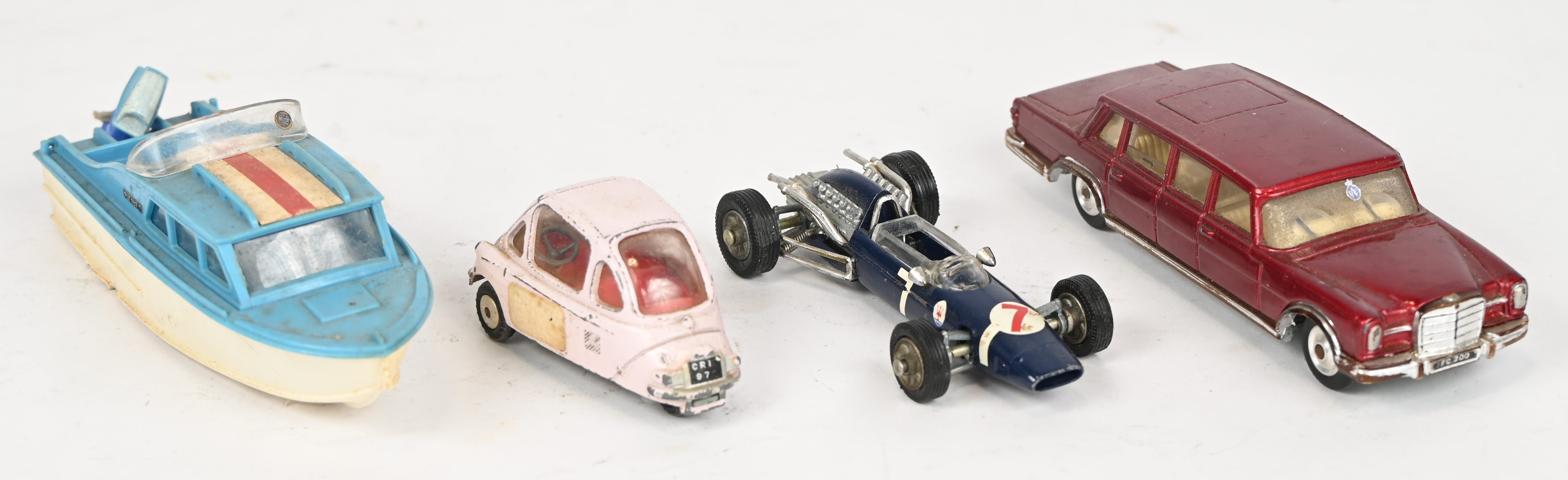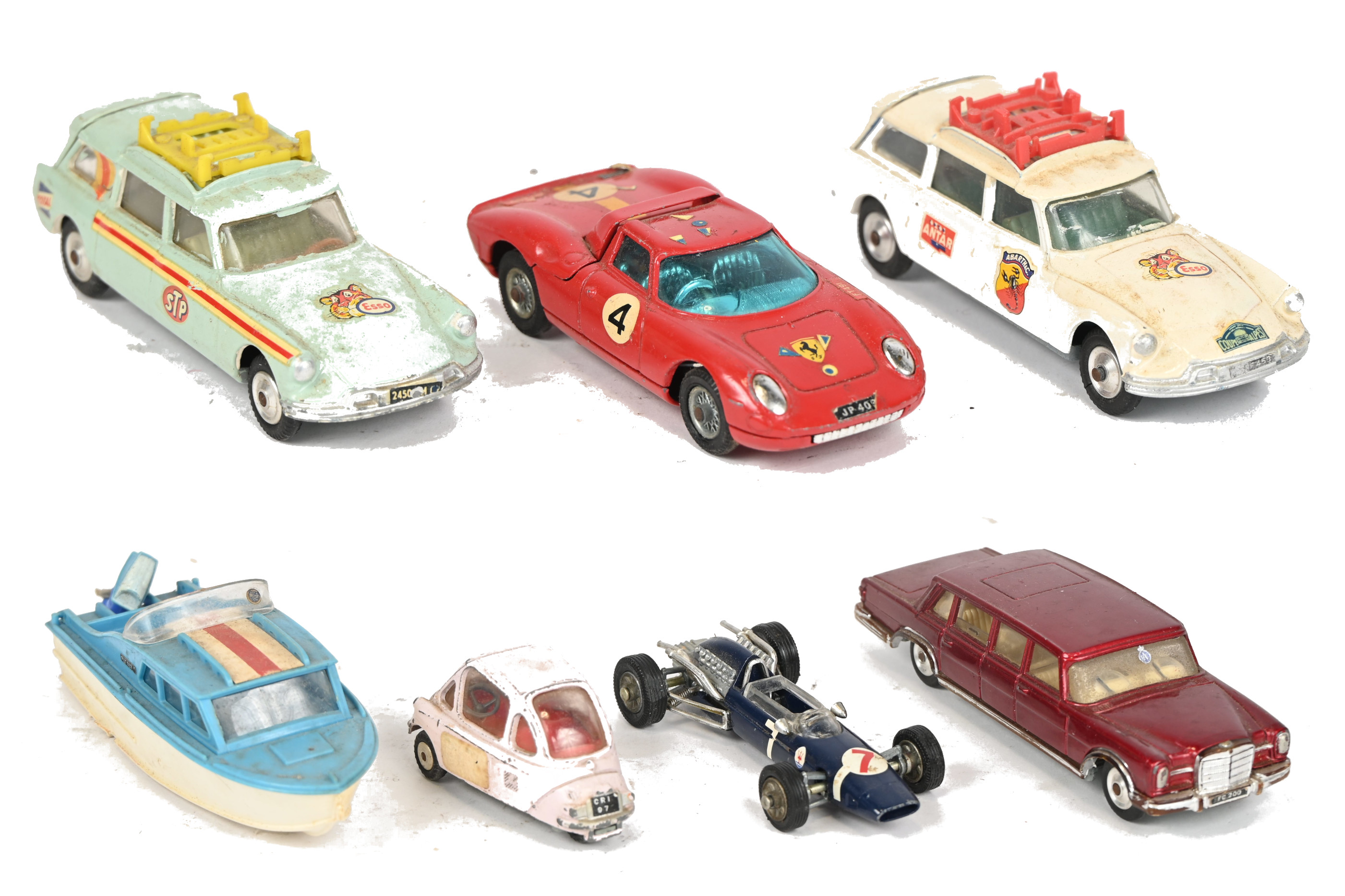 Een lot van 6 vintage die-cast voertuigen en een plastic boot: Mercedes Benz 600 Pullman, 2 x Citroën Safari, Ferrari Berlinetta, Heinkel, Cooper Maserati Formula 1 en Dolphin 20 4 Berth Cruiser.