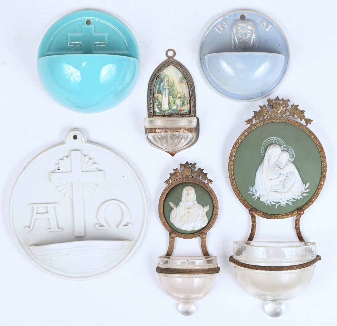 A lot of 6 holy water fonts, porcelain, bisque, copper and glass, 19th/20th century.