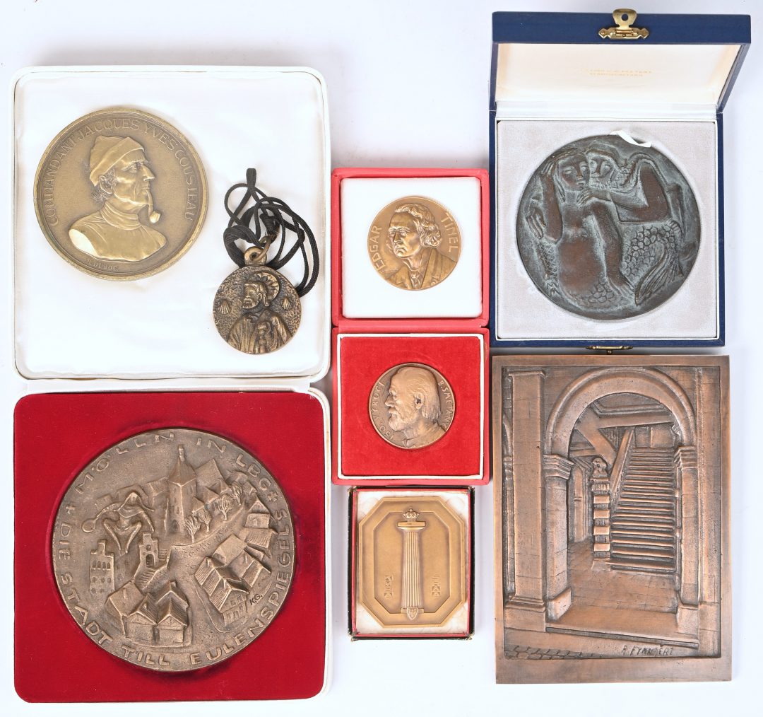 A lot of 7 bronze medals and a plaque: Molln, The town of Till Eulenspiegel, the Rubens House, official opening Kindervreugd 1962, Commander Jacques Yves Cousteau, B. Smetany, Royal Society of Master Builders of Antwerp, Edgar Tinel and Ano Santo Compostelano 1965 Spain.