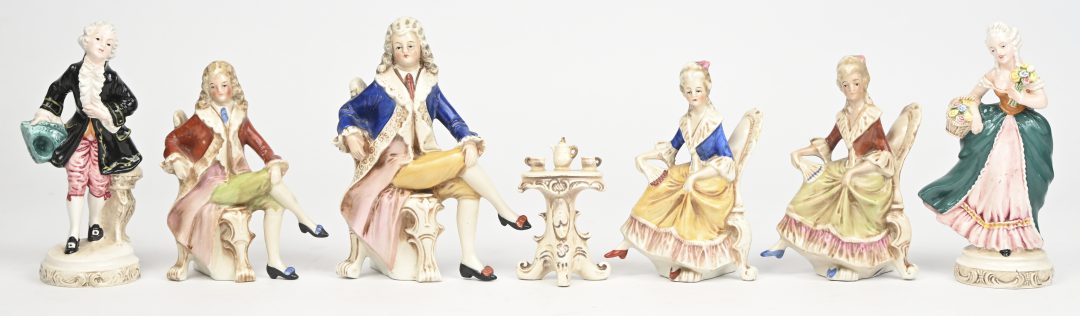 Een lot van 7 porseleinen beeldjes van Duitse en Italiaanse oorsprong.