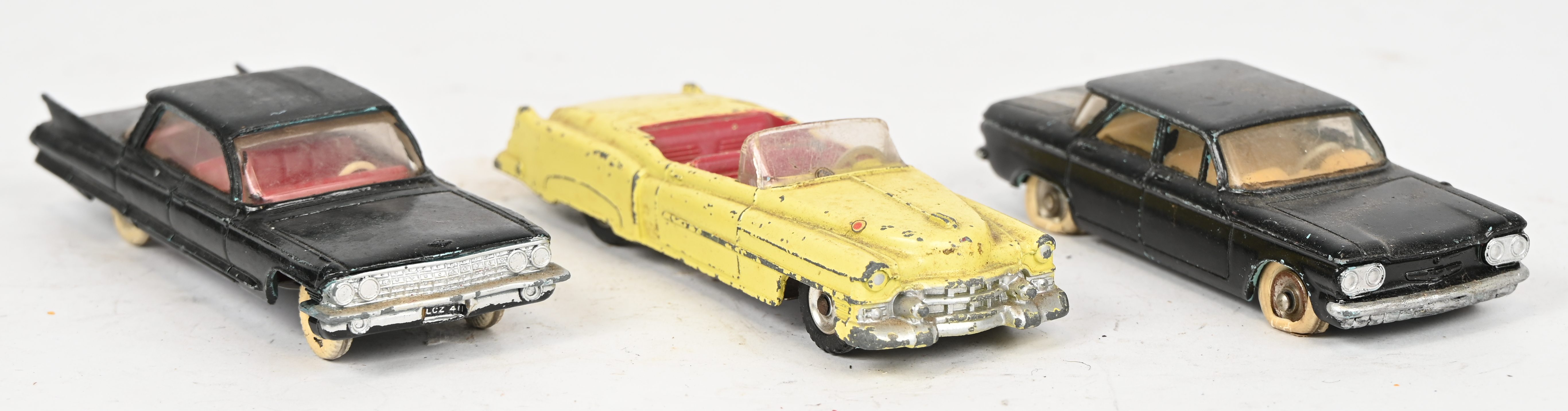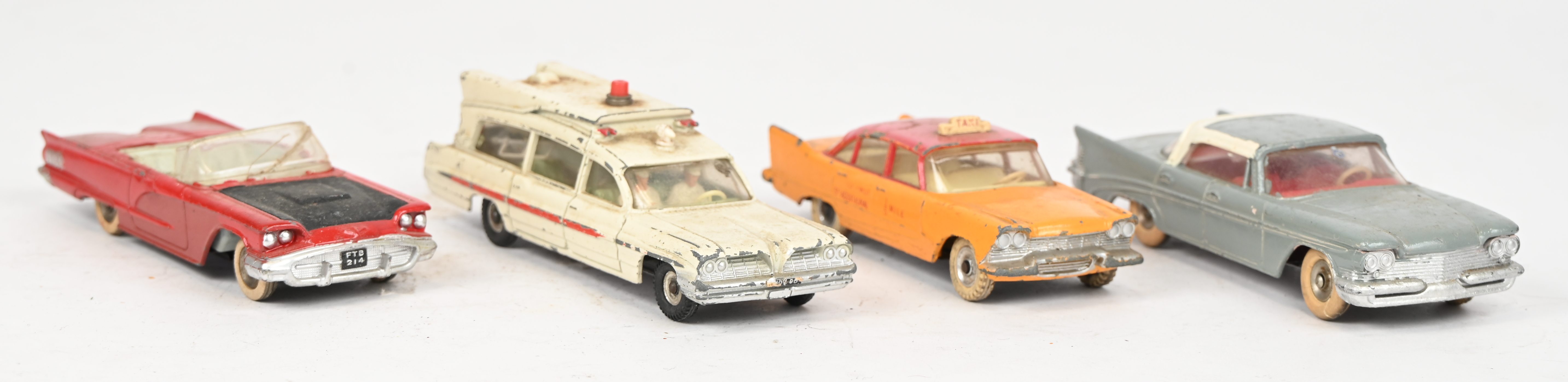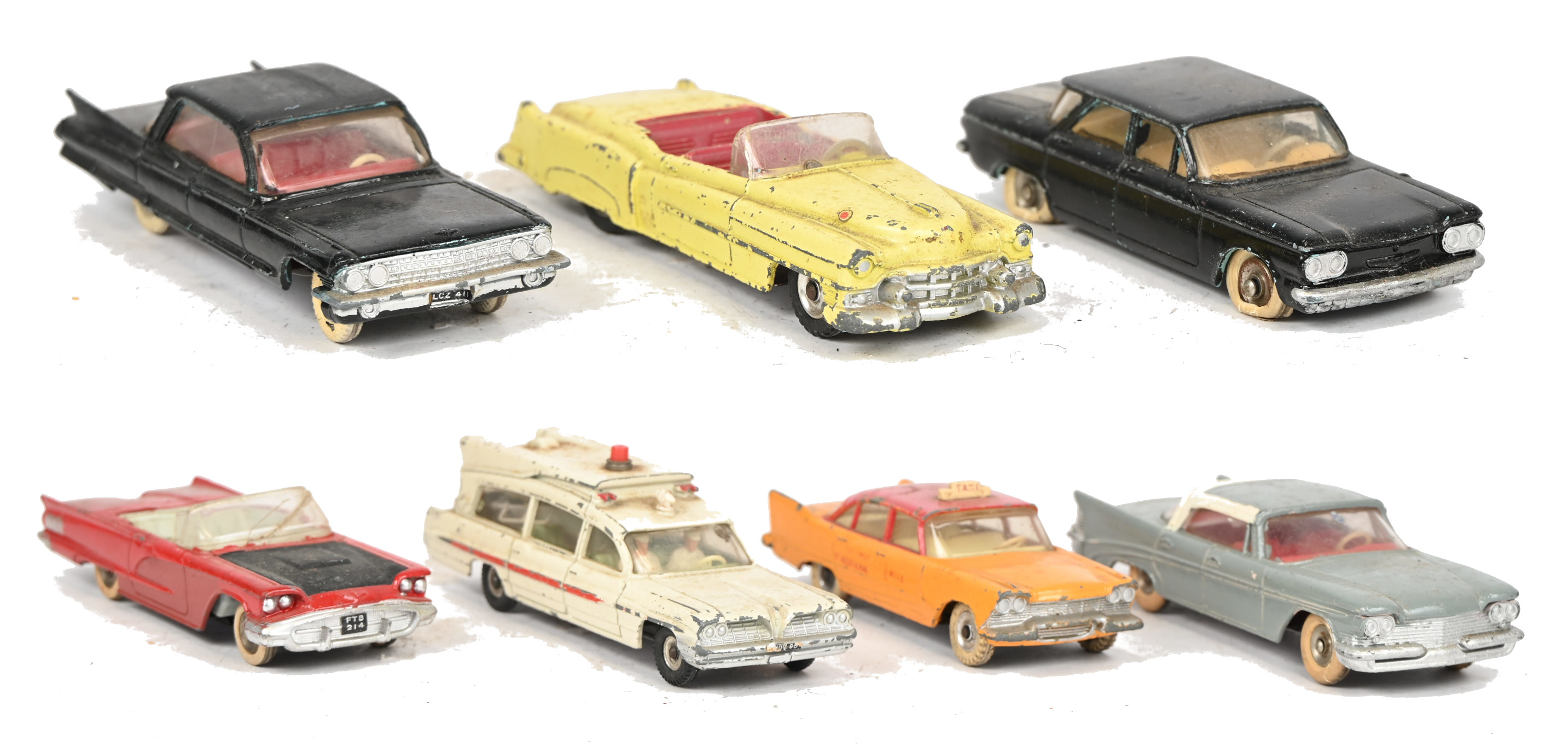 Een lot van 7 vintage die-cast Amerikaanse auto’s: Superior Criterion ambulance, Chrysler Saratoga, Caddilac Eldorado, Caddilac 62, Plymouth Plaza, Chevrolet Corvair en Ford Thunderbird met gebarsten ruit.
