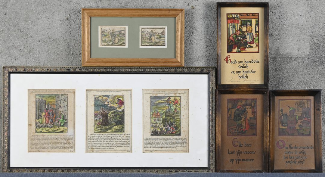 A series of six religiously inspired etchings. Colored with acrylic, signed illegibly.No longer availableOnline onlyActive bid: 6.00 €Dim. 18/66 cmEstimate: € 20 / 30 -