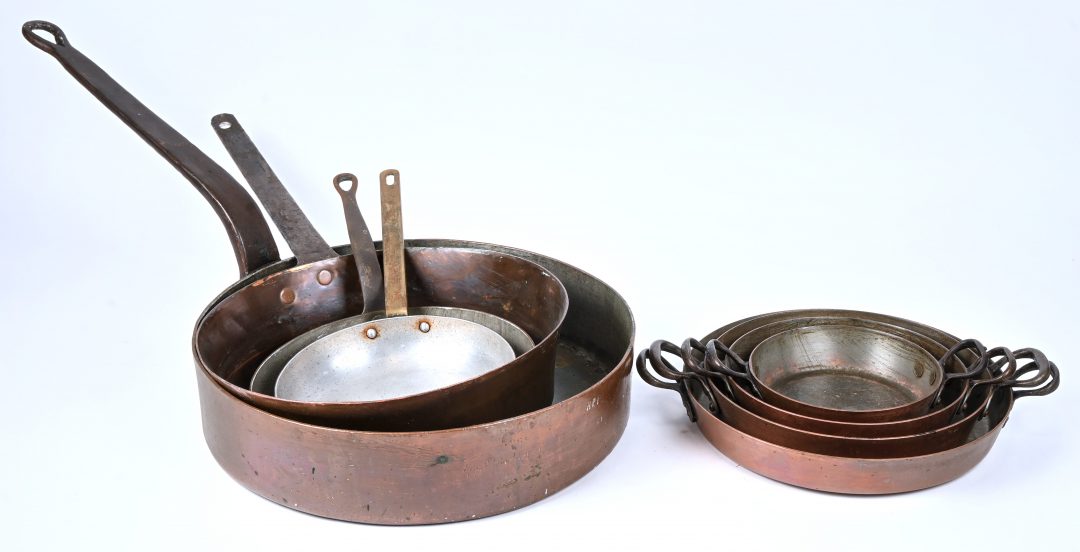 Een lot van 8 koperen kookpannen waarvan 1 xxl.