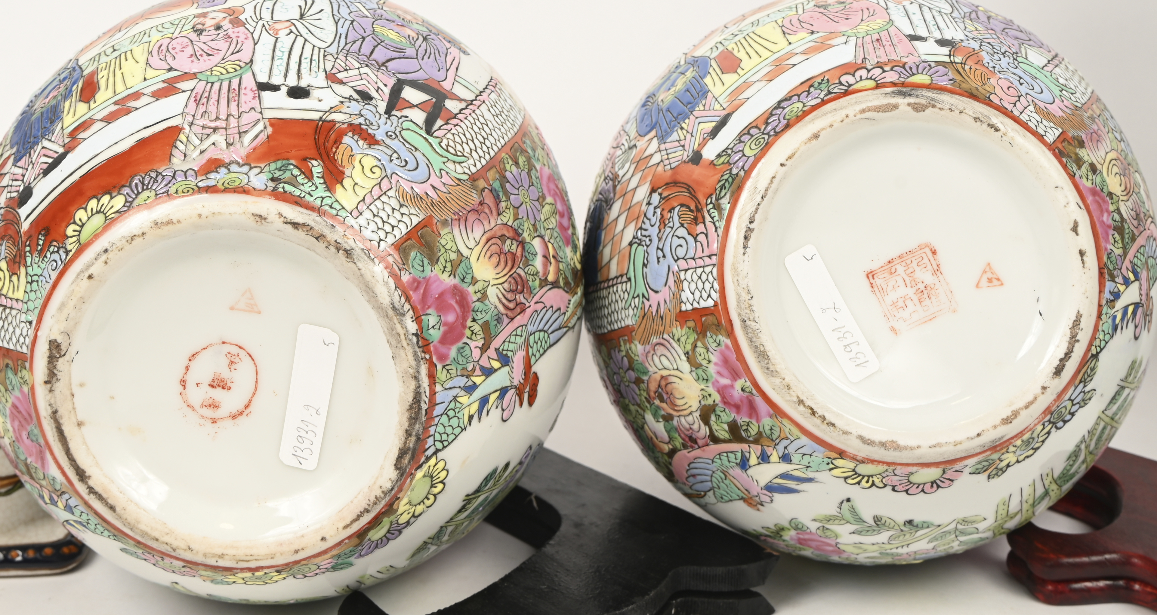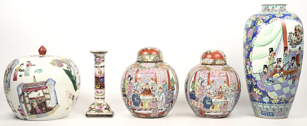 group of 7 recent Cantonese decor bowls, bowls and vases with lids. Marked at the bottom. -