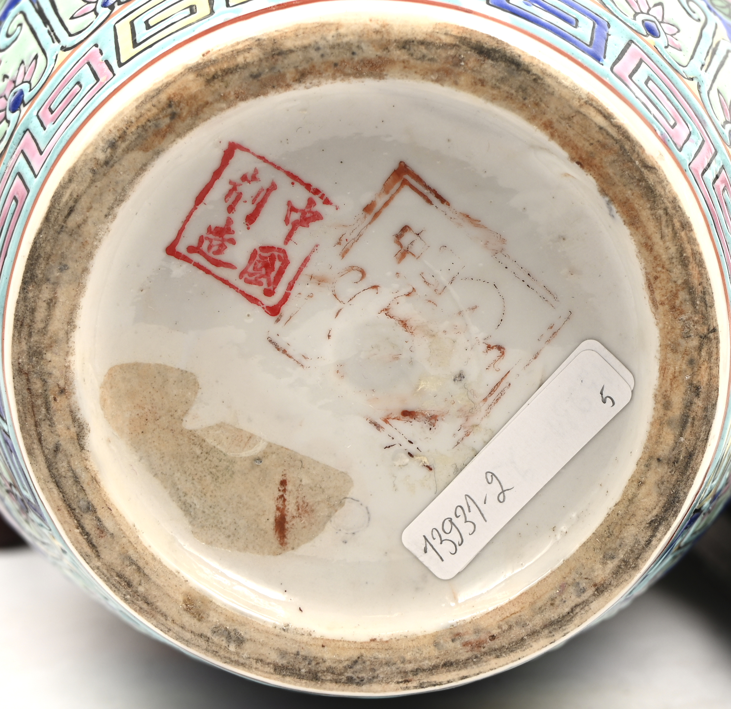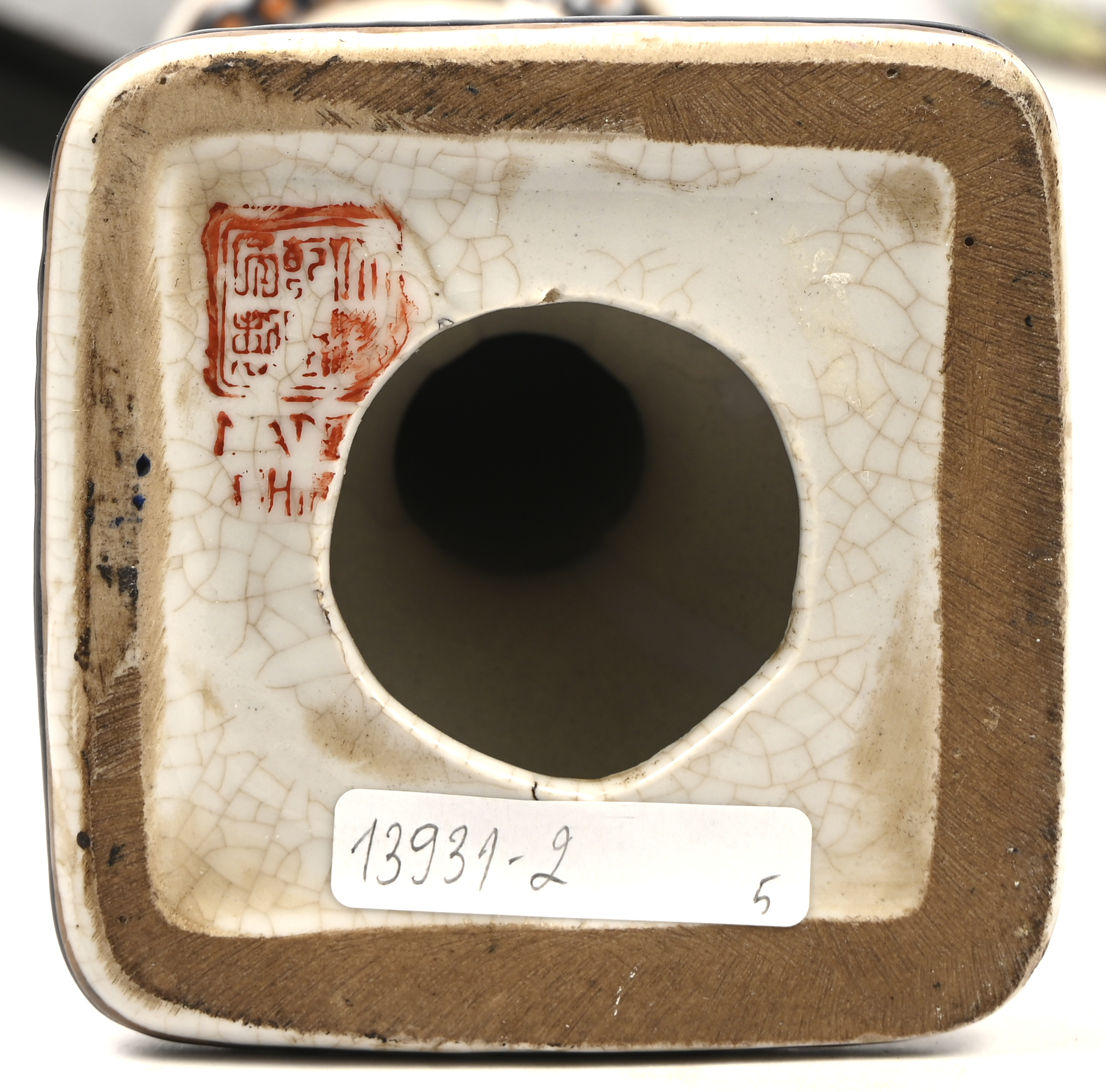#104Een kleine Chinese gemberpot, late Qing dynastie, op houten sokkel. Het deksel is gelijmd, stukjes manco. Toegevoegd een recentere gemberpot.