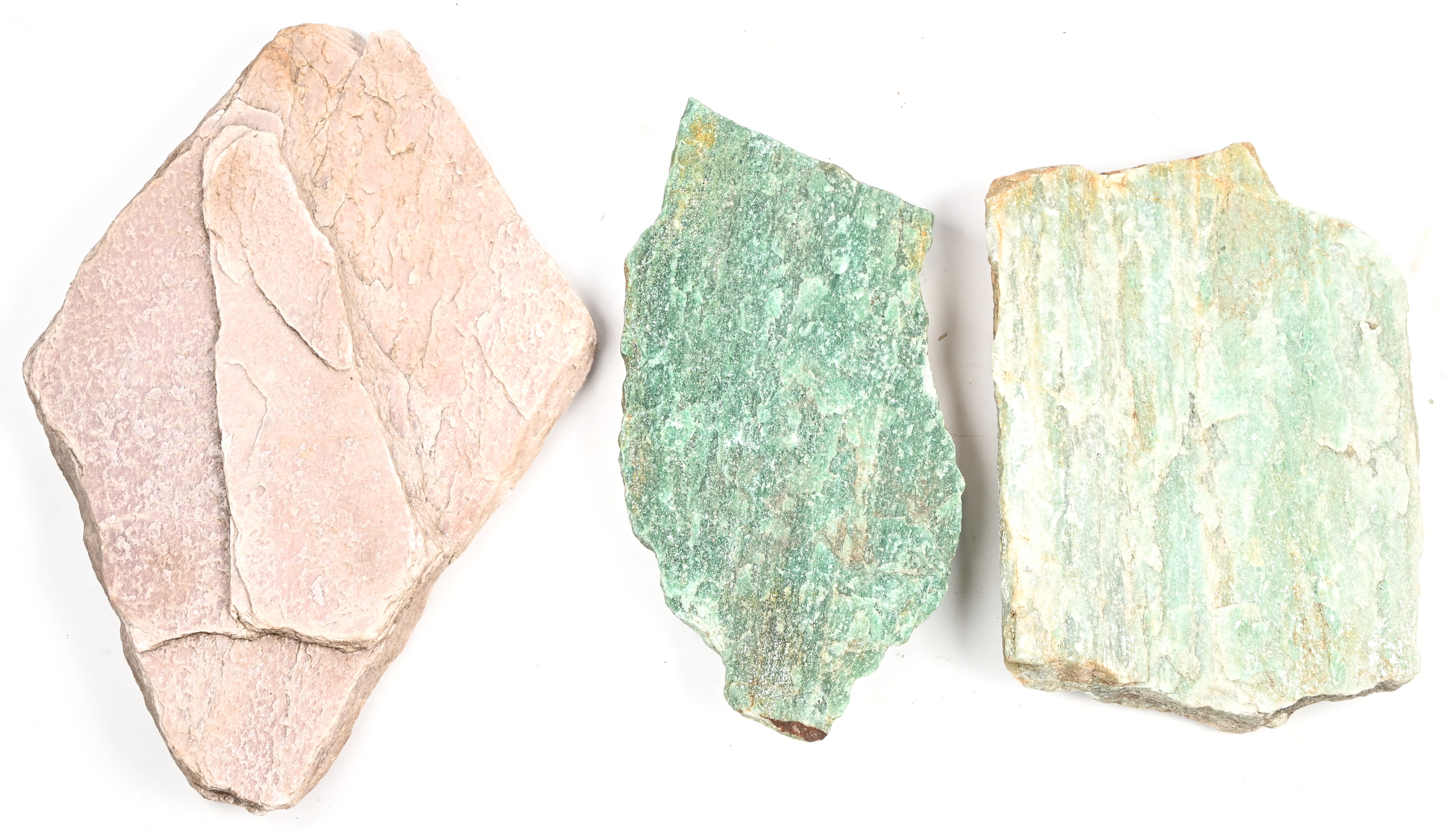 A lot of three rough gemstones, light green fuchsite, green fuchsite, and lepidolite.