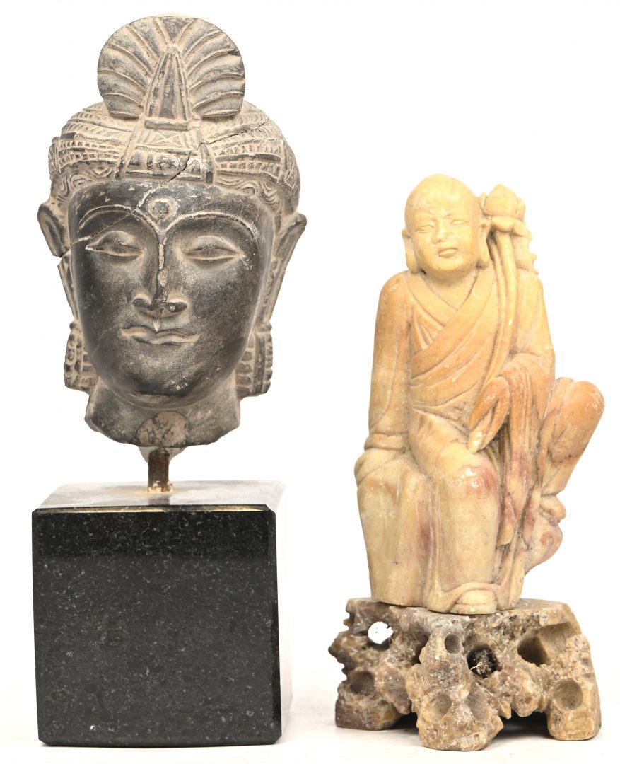 Een Aziatische sculptuur van een man met een pauwenoofdtooi.