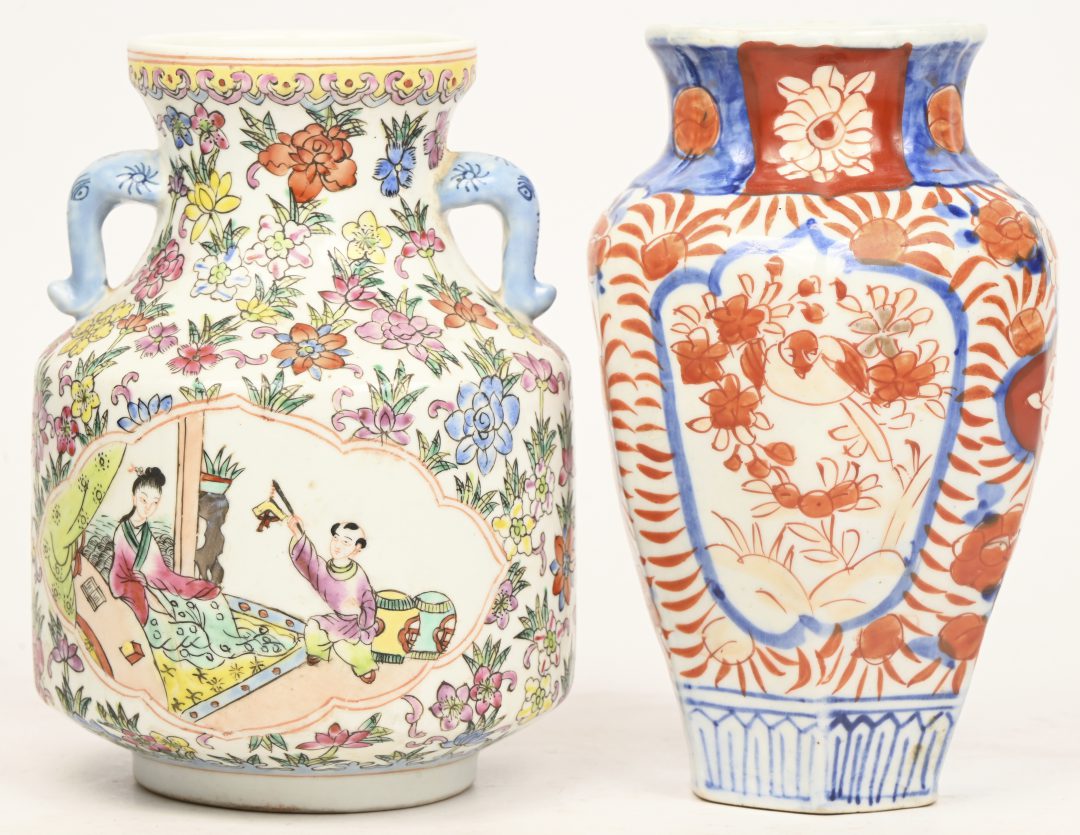 Handbeschilderde vaas in faience met florale motieven, toegevoegd een vaasje met oosterse motieven.