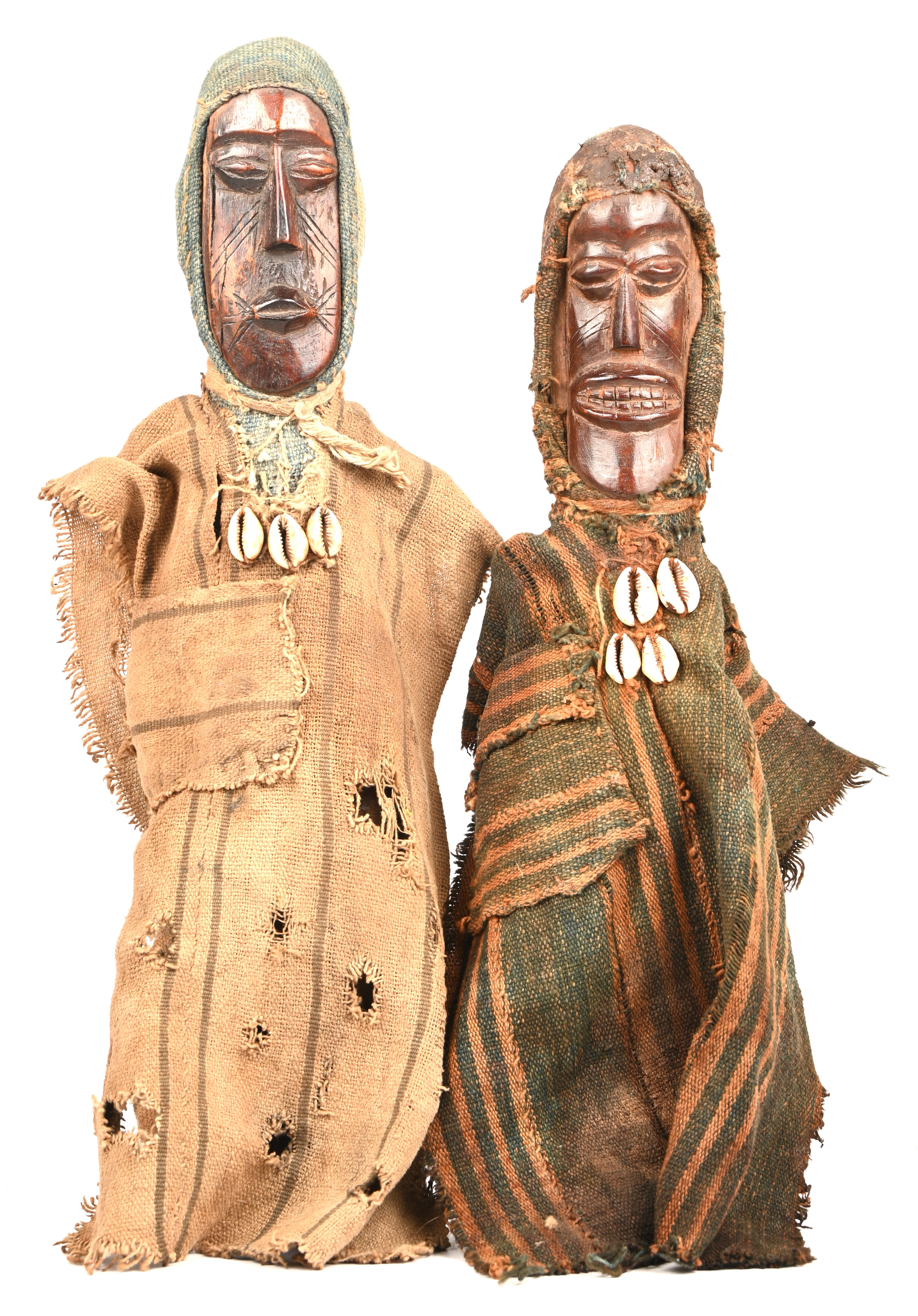 Een paar aardewerken kruikjes met kobaltblauwe halzen en een monochrome guirlande op de buik. Onderaan gemerkt. Schilfers aan de tuiten.