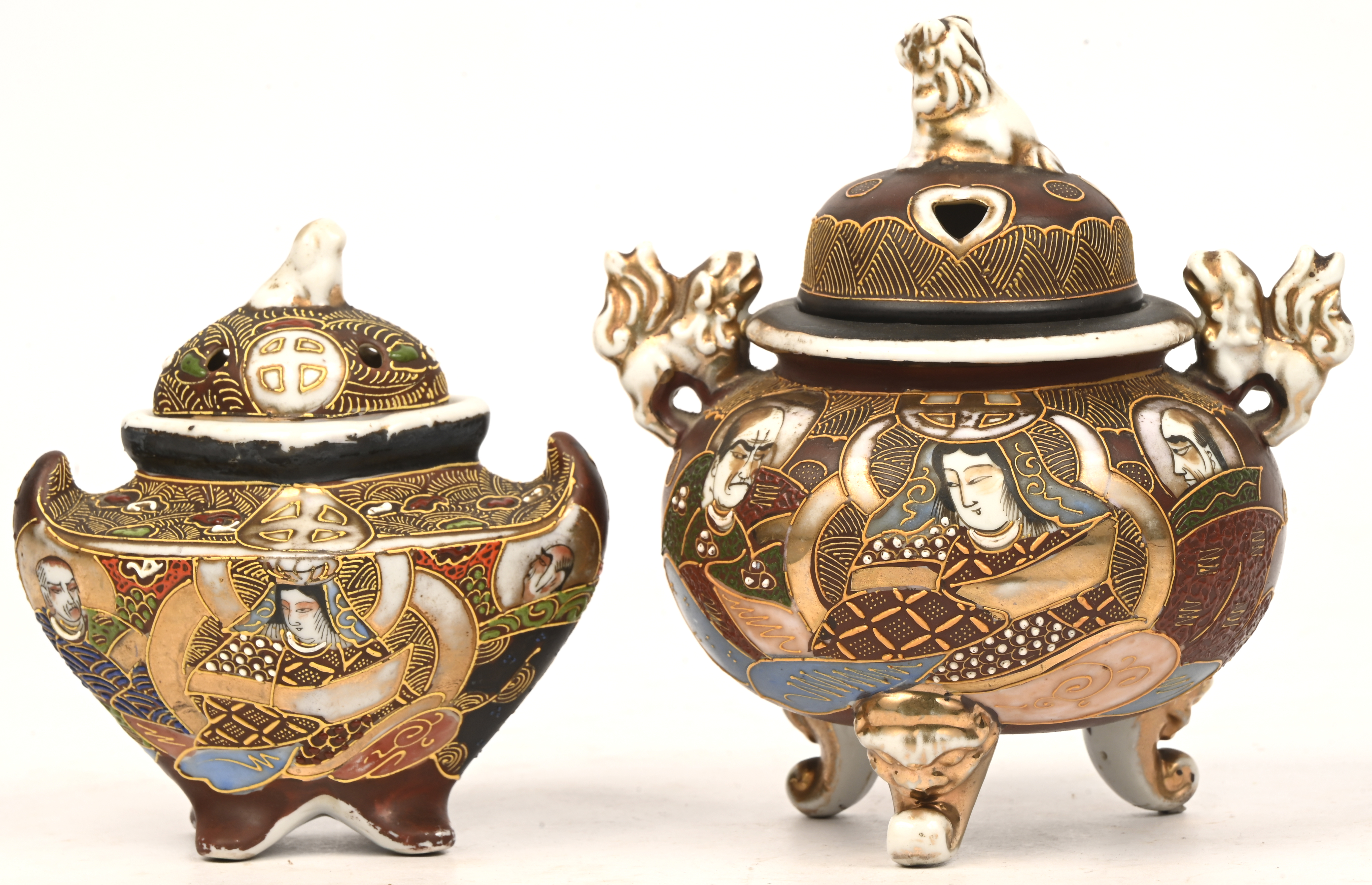 Een keramische dekselvaas in Delft blauw, gemerkt Petrus Regout Maastricht, toegevoegd een vaasje gemerkt DEC: Delfts. Hs.