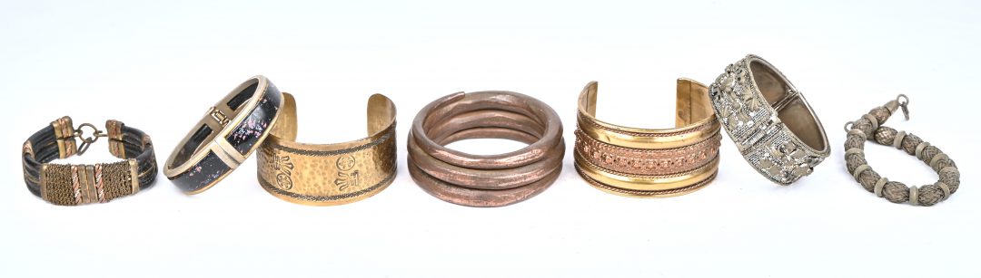 #406Een sac-à-perles luchter van koper en kristal met zes armen.