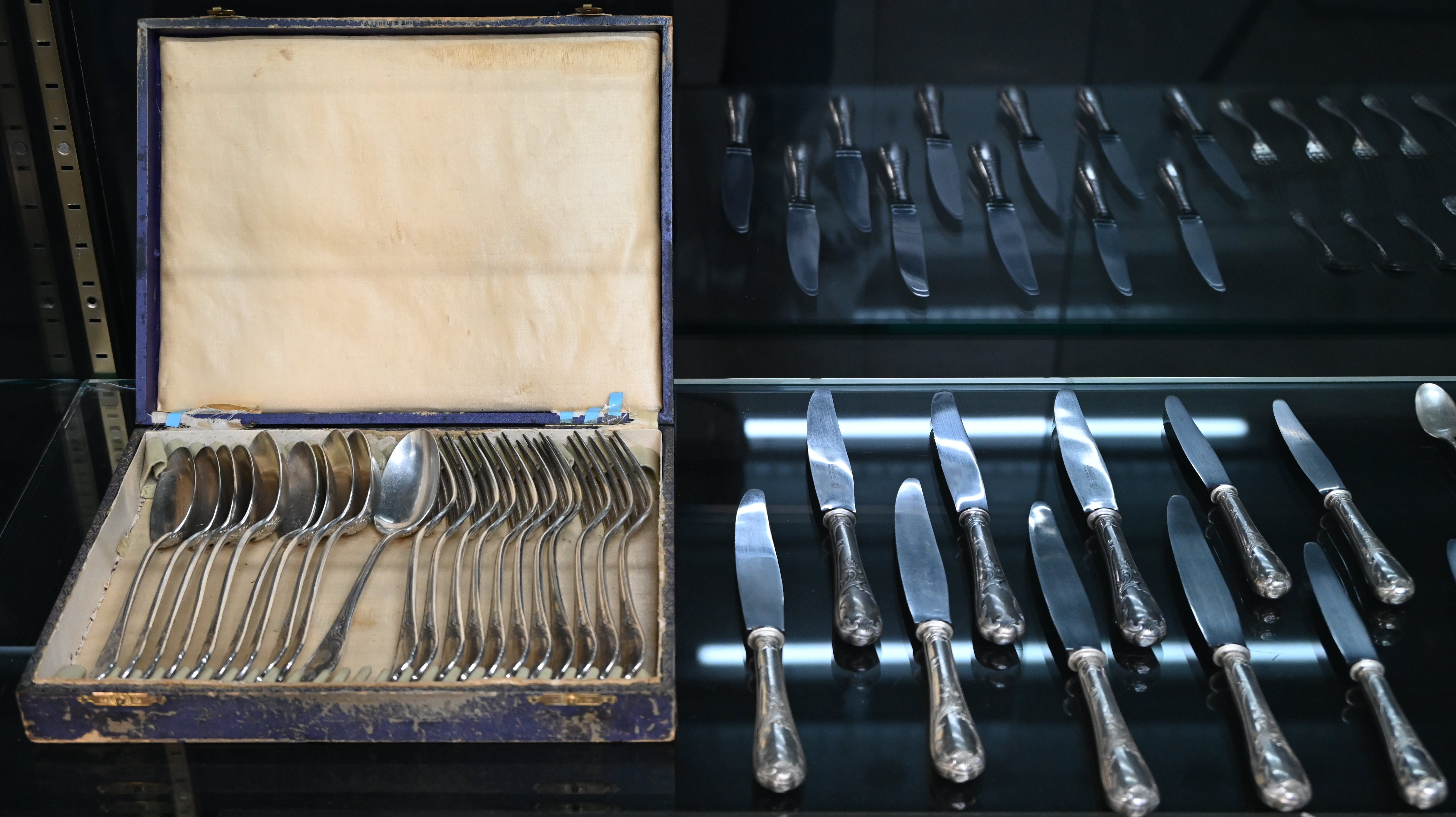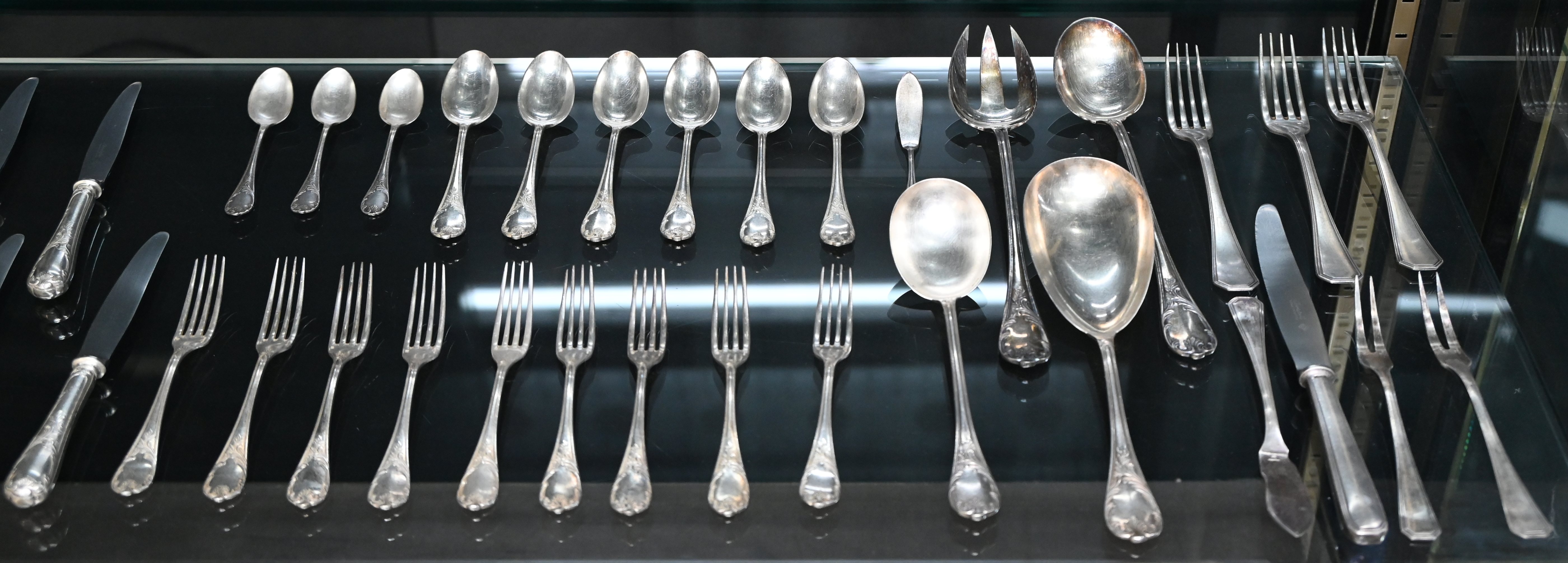 A 129-piece silver-plated metal cutlery set for 12 people in a wooden cutlery case. Marked Ventura.No longer availableDim. 32 x 50 x 36 cmEstimate: € 150 / 200 -