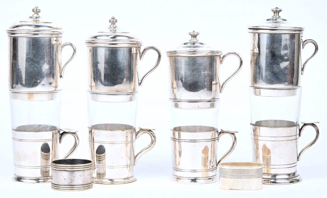 Een lot verzilverd metaal bestaande uit 4 koffiefilters gemerkt Wiskemann en 2 servetringen gemerkt Christofle.