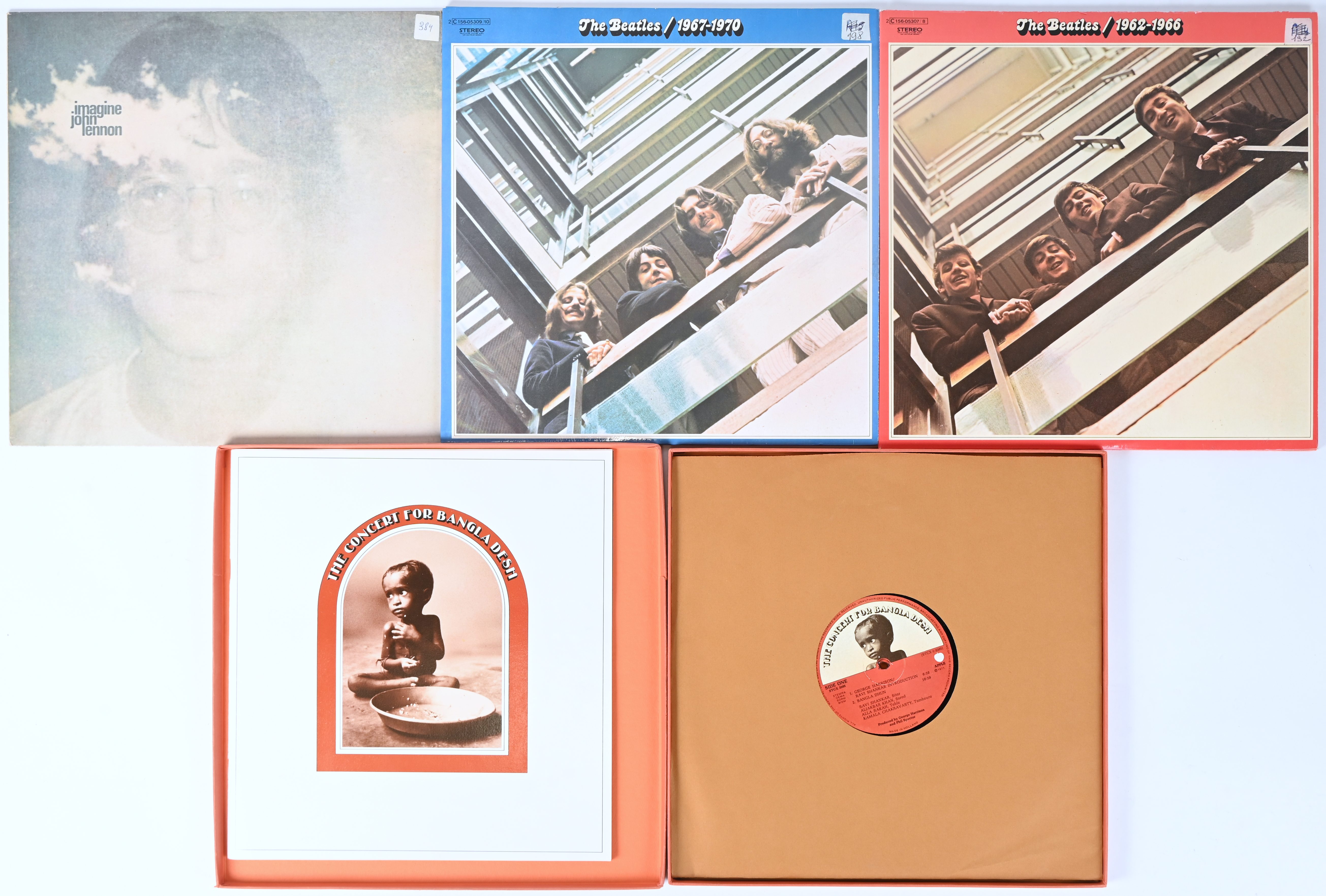 A lot of vinyl records: Beatles: 1962-1966 (the red) - 165-05307, 1967-1970 (the blue) - 165-05309, John Lennon - Imagine - 5C062-04914 and The Concert for Bangla Desh - STCX 3385.