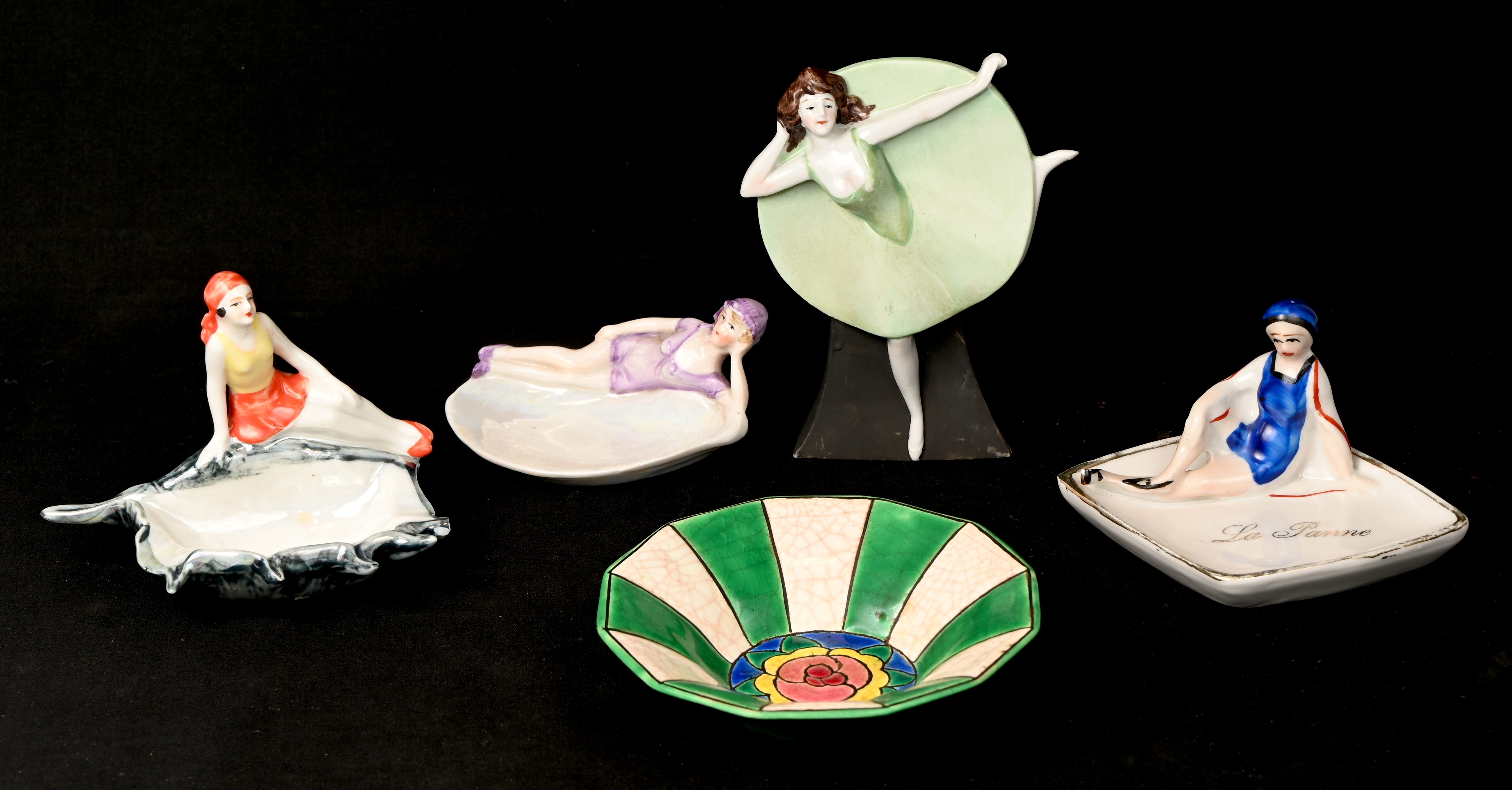 Een lotje art-deco porselein bestaande uit 3 schaaltjes met flapper-girls, een vaasje met dansende dame en een Longwy schaaltje. Schelpvormig schaaltje met schade.