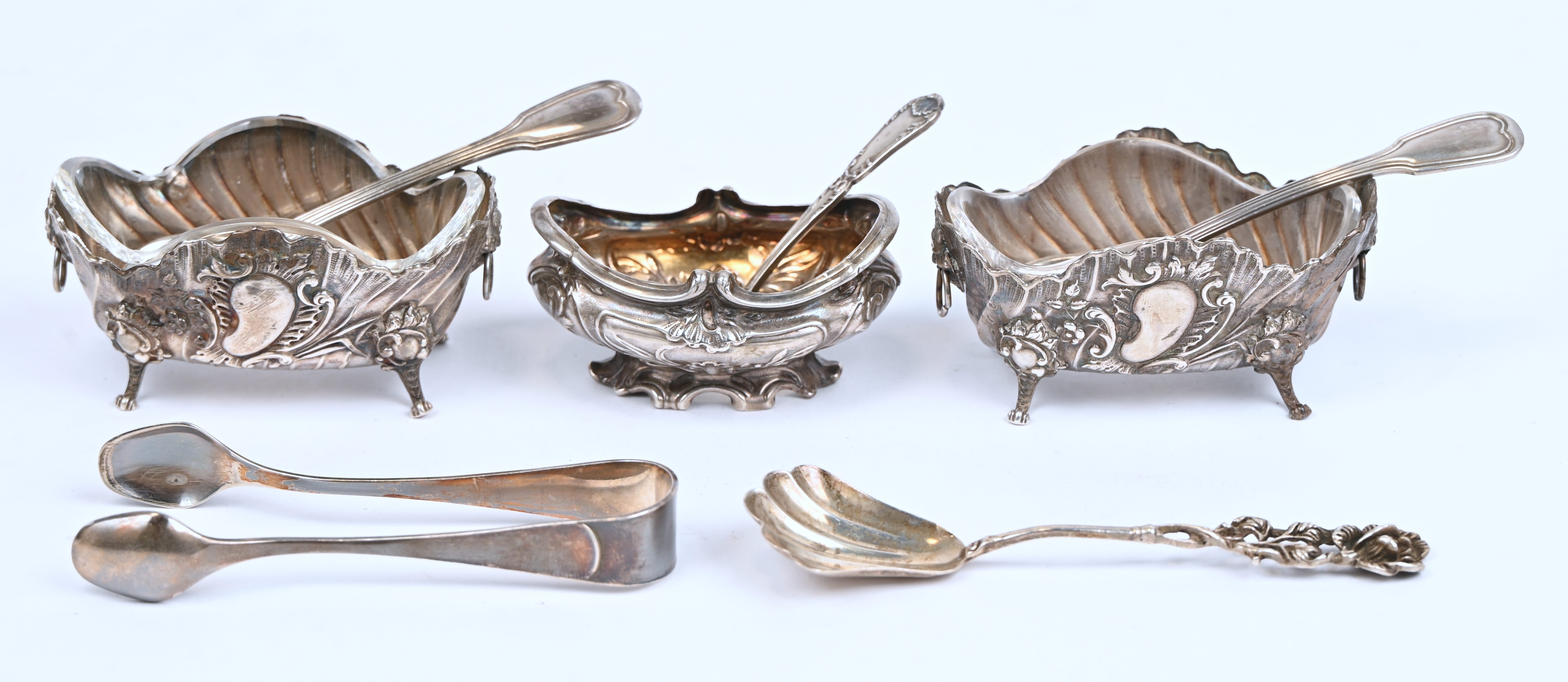 Een lotje zilver, bestaande uit 2 schaaltjes met glazen inzet, 1 schaaltje waarvan het glas manco, 1 suikertang en 4 lepeltjes. 140 gram.