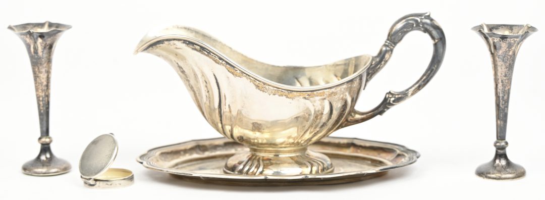 A lot of silver items including a sauce boat, marked A835, 195 grams - a set of 2 solifleur vases, marked Birmingham, date letter g (1906), SML (Samuel M. Levi), 35 grams with slightly weighted feet - a pill box, marked 835, 10 grams.