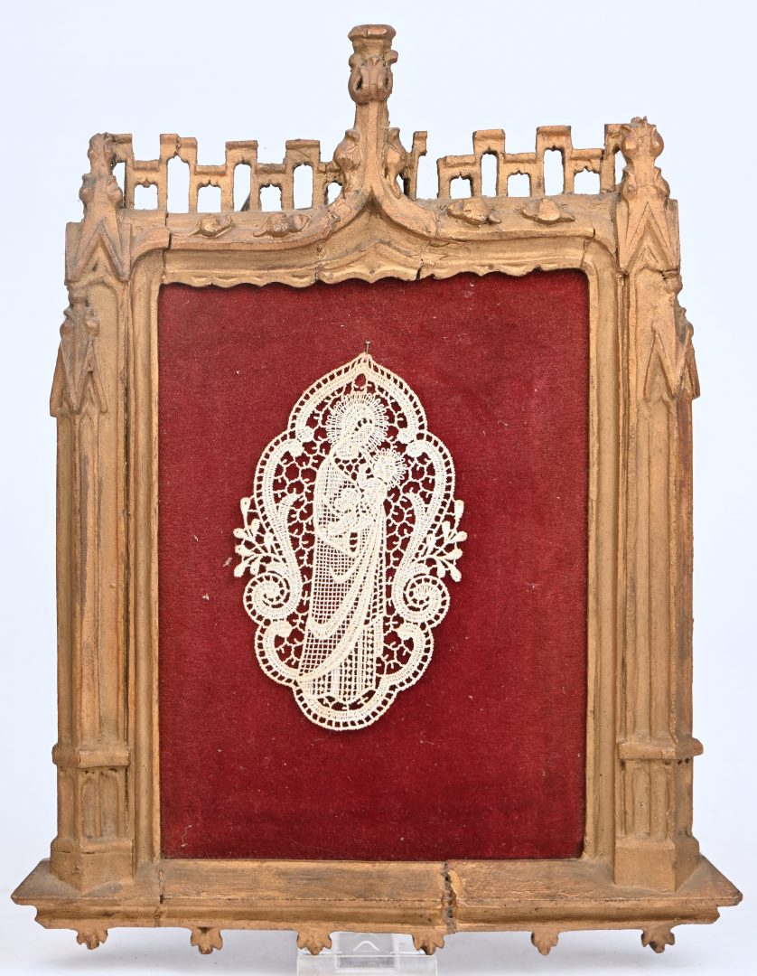 Een Madonna met kind van lintkant. In een houten lijst gebeeldhouwd in gotische stijl.