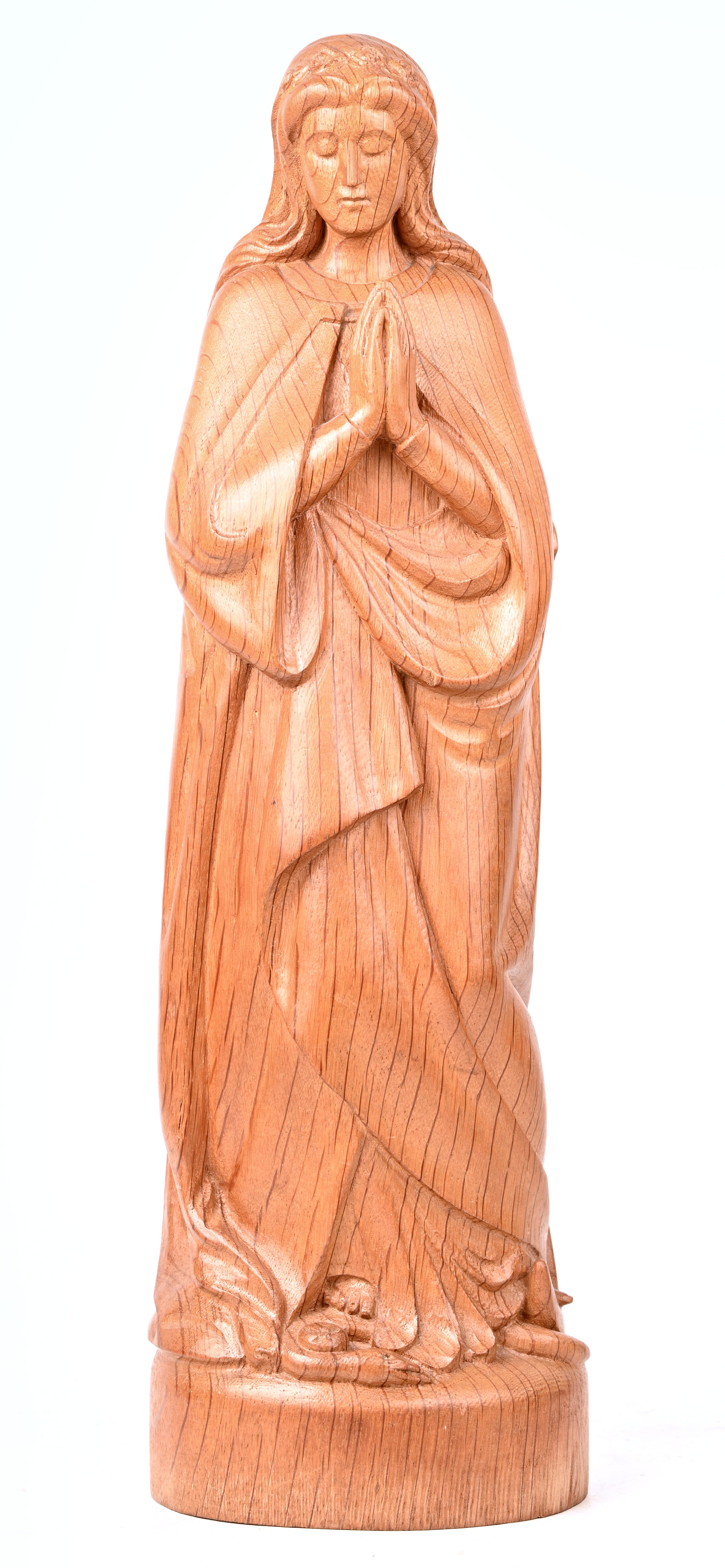 Een madonnabeeld van gebeeldhouwd notenhout. Gesigneerd