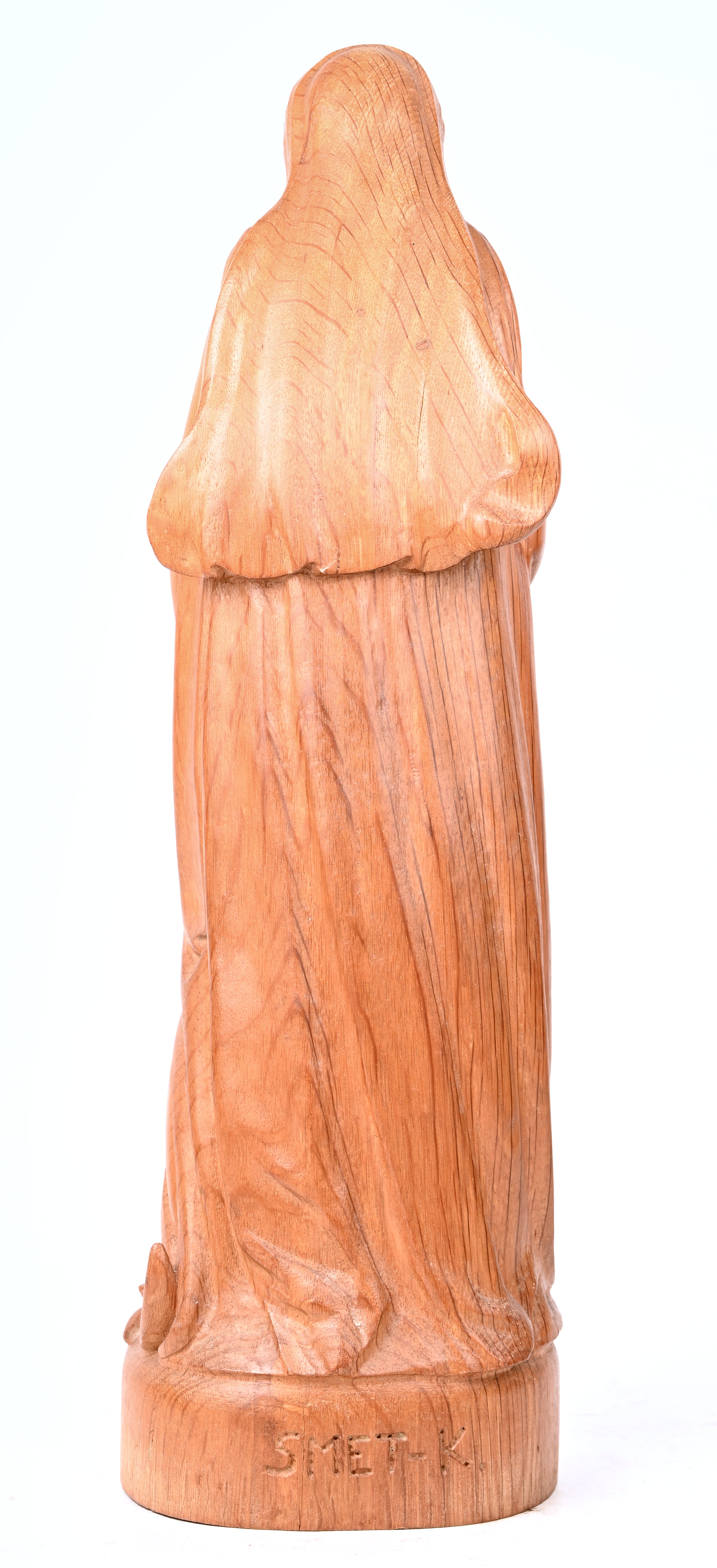 A madonna statue carved from walnut wood. Signed.