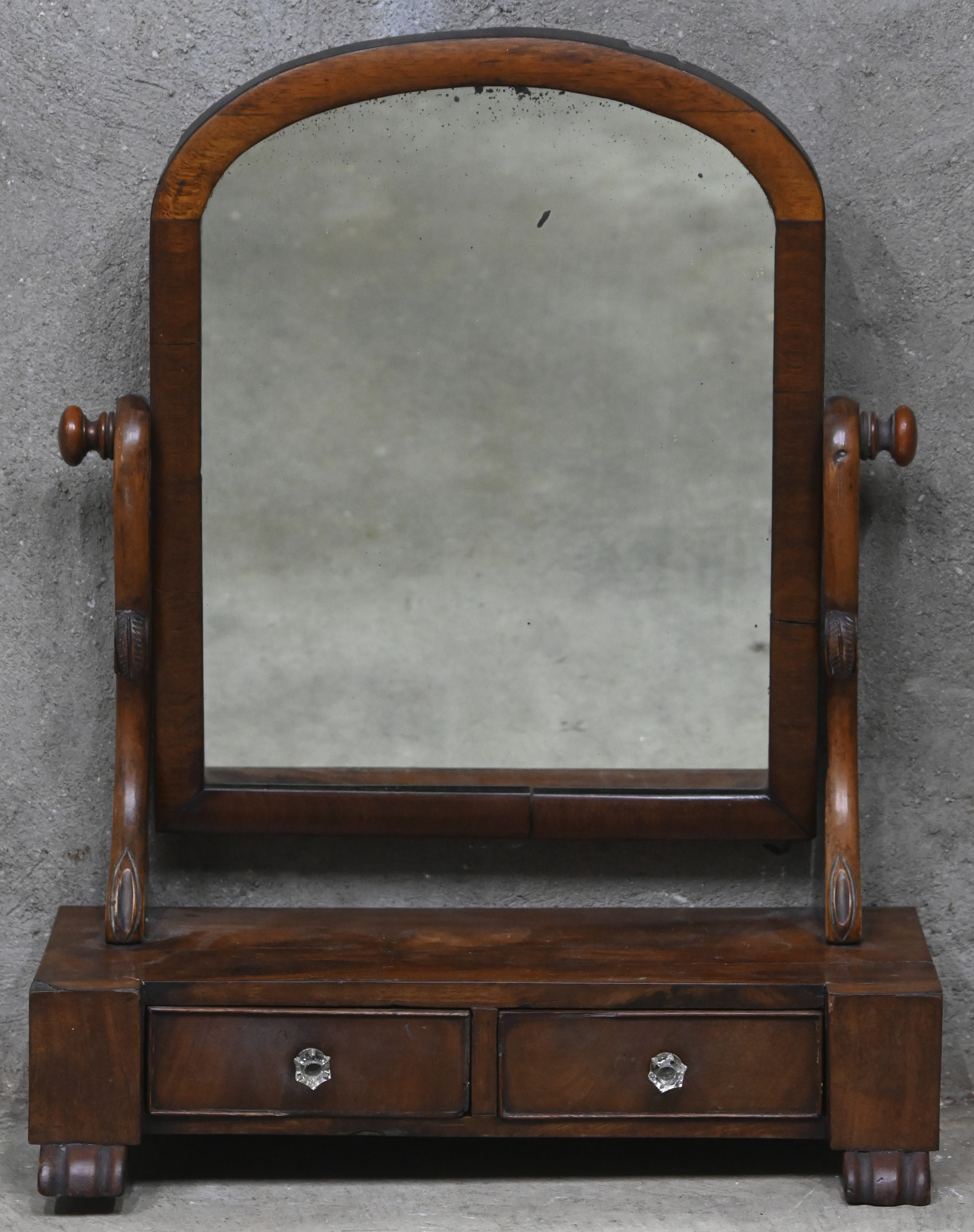 #326Een houten kaptafeltje, opklapbaar blad met spiegel en één lade.