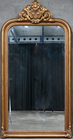 #117Een grote geslepen spiegel, vergulde kader met kuif.