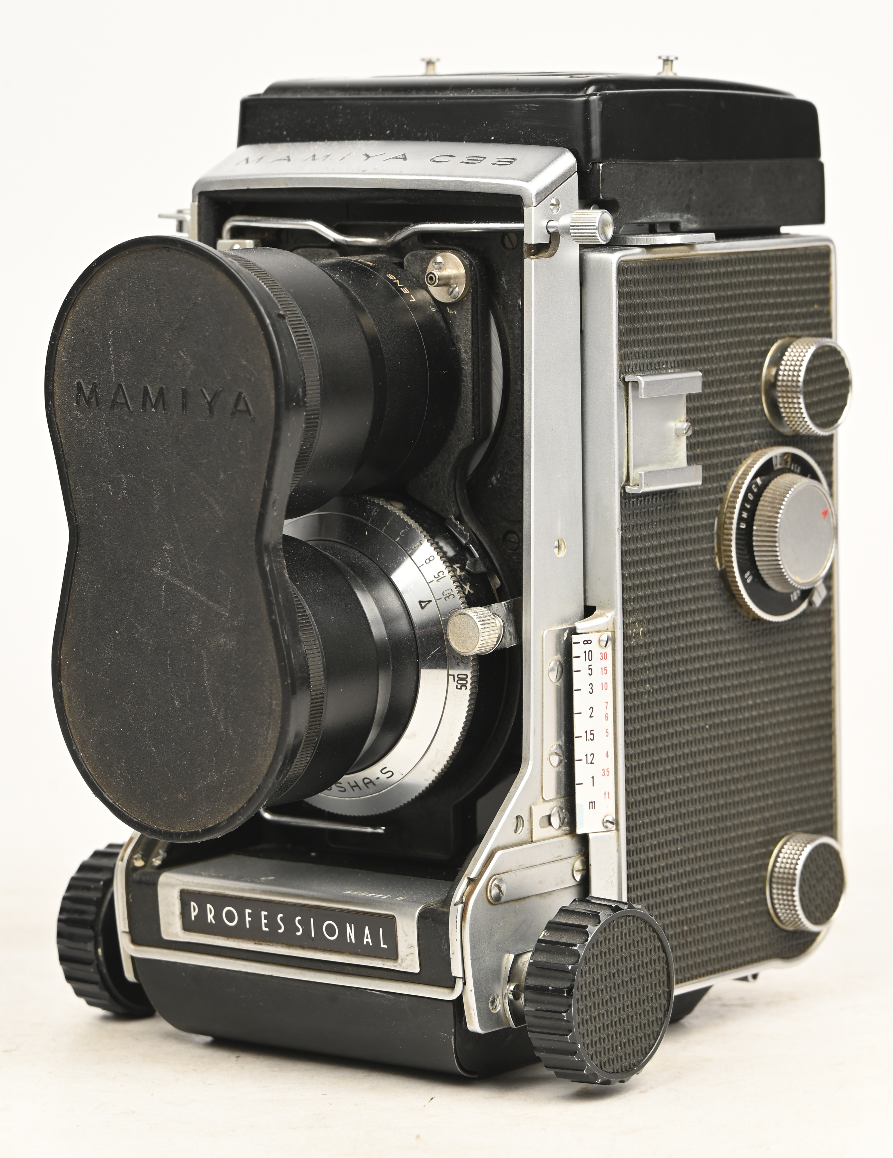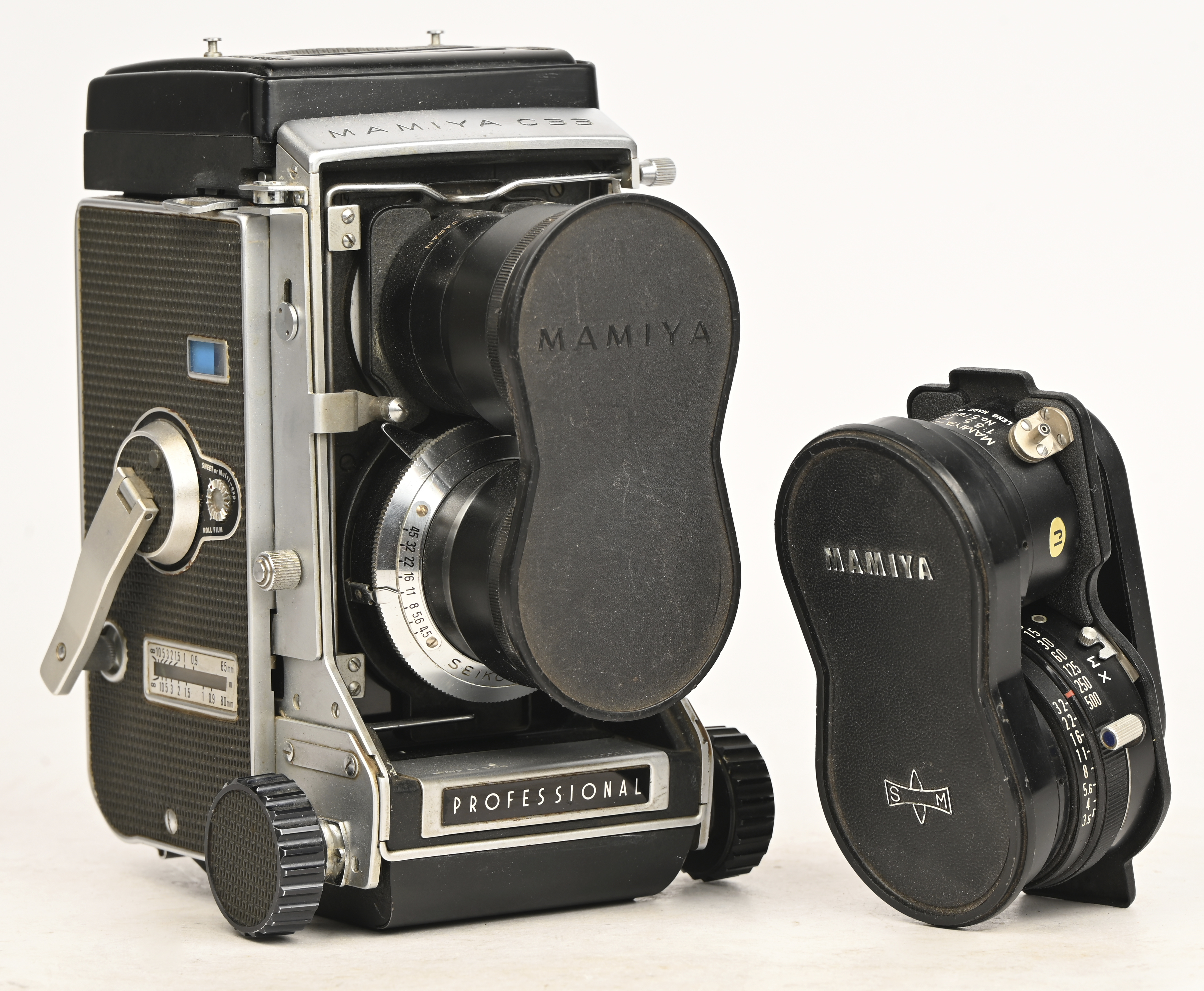 A Mamiya C-33 PROFESSIONAL 6X6 camera, with 65mm and 135mm lenses.