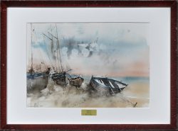 #122Etienne Maes‘Vissersloepen op het strand’, een impressionistisch aquarel. Getekend; E. Maes, ‘07.