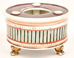 #91Een Empire inktstel op drie leeuwenpootjes, met plaats voor drie pennetjes. Inktpot is manco en er is schade aan twee pootjes.