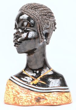 #3Een geglazuurde aardewerken buste van een jonge Afrikaanse vrouw. Getekend; Ndala, Kin. ‘98.