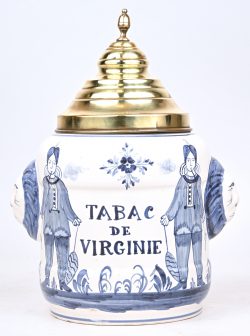 An earthenware tobacco jar with a copper lid. Inscribed with: Tabac de Virginie. -