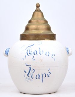 #6Een tabakspot van blauw wit geglazuurd aardewerk. Met opschrift ‘Tabac rapé’. Onderaan gemerkt met reliefstempel.