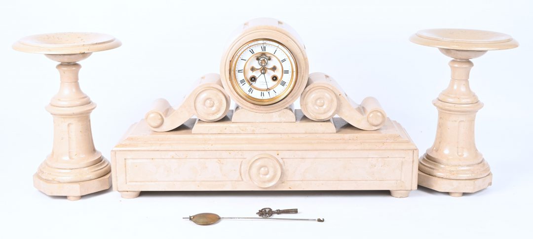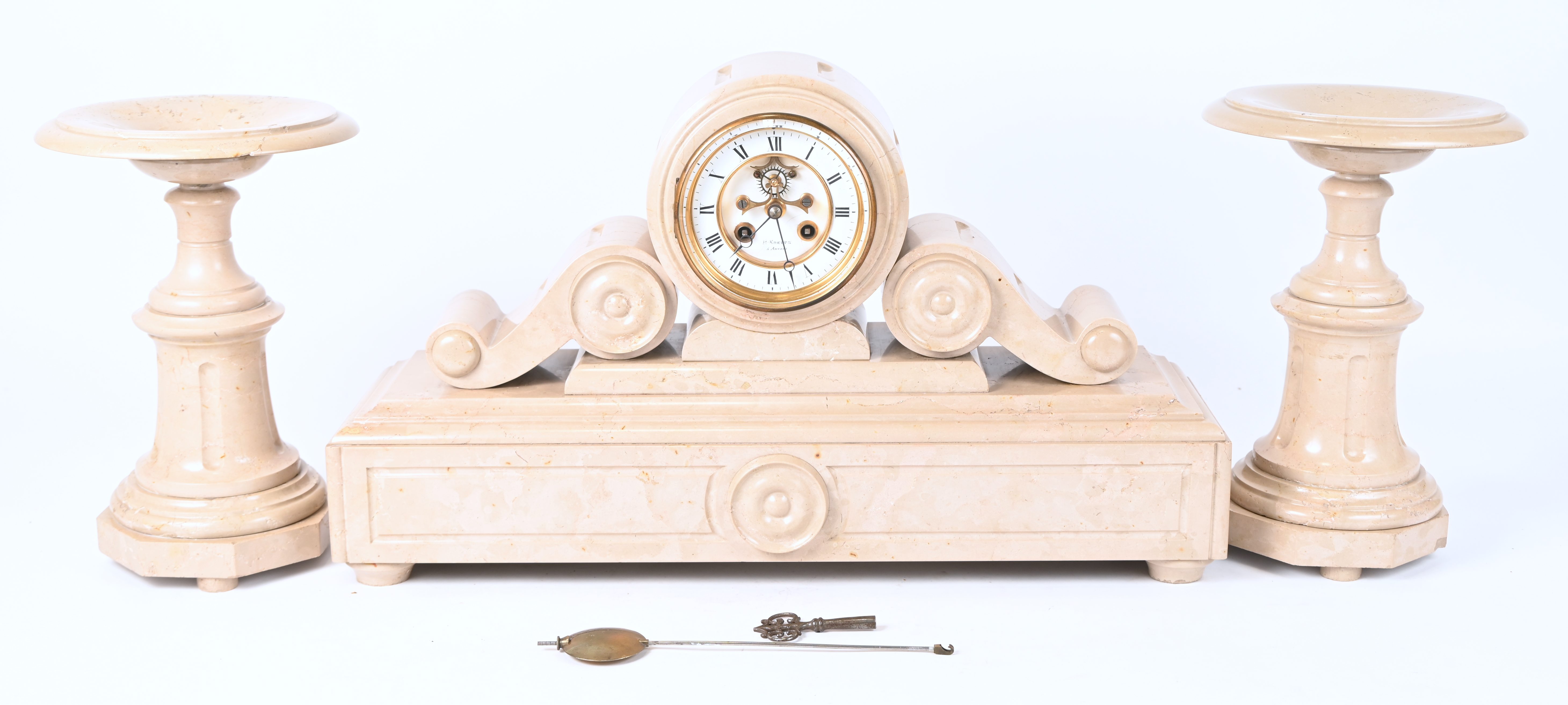A marble mantel clock with matching ornaments. The dial is marked ‘A. Kreits, Anvers’.
