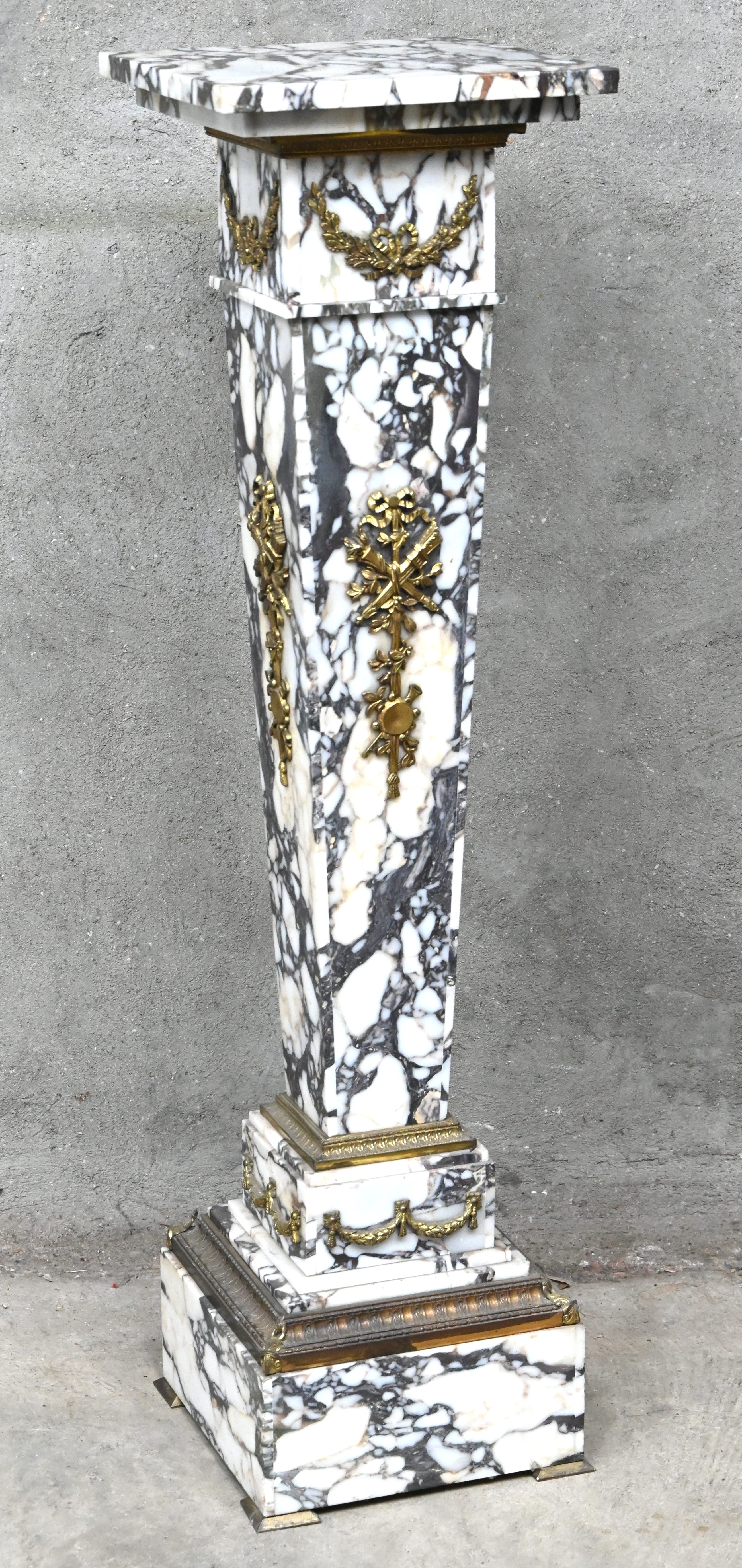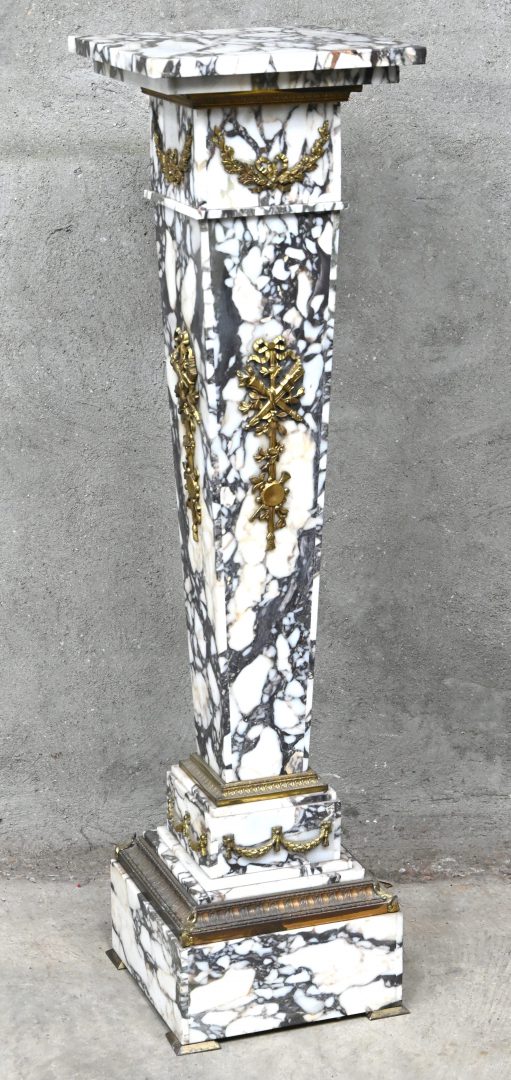 Een marmeren pied-de-stalles met verguld bronzen elementen. Roterend blad.