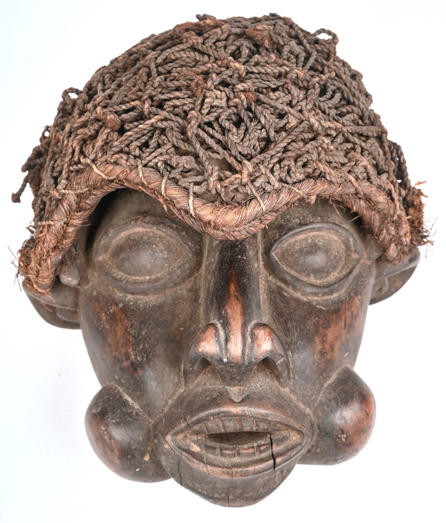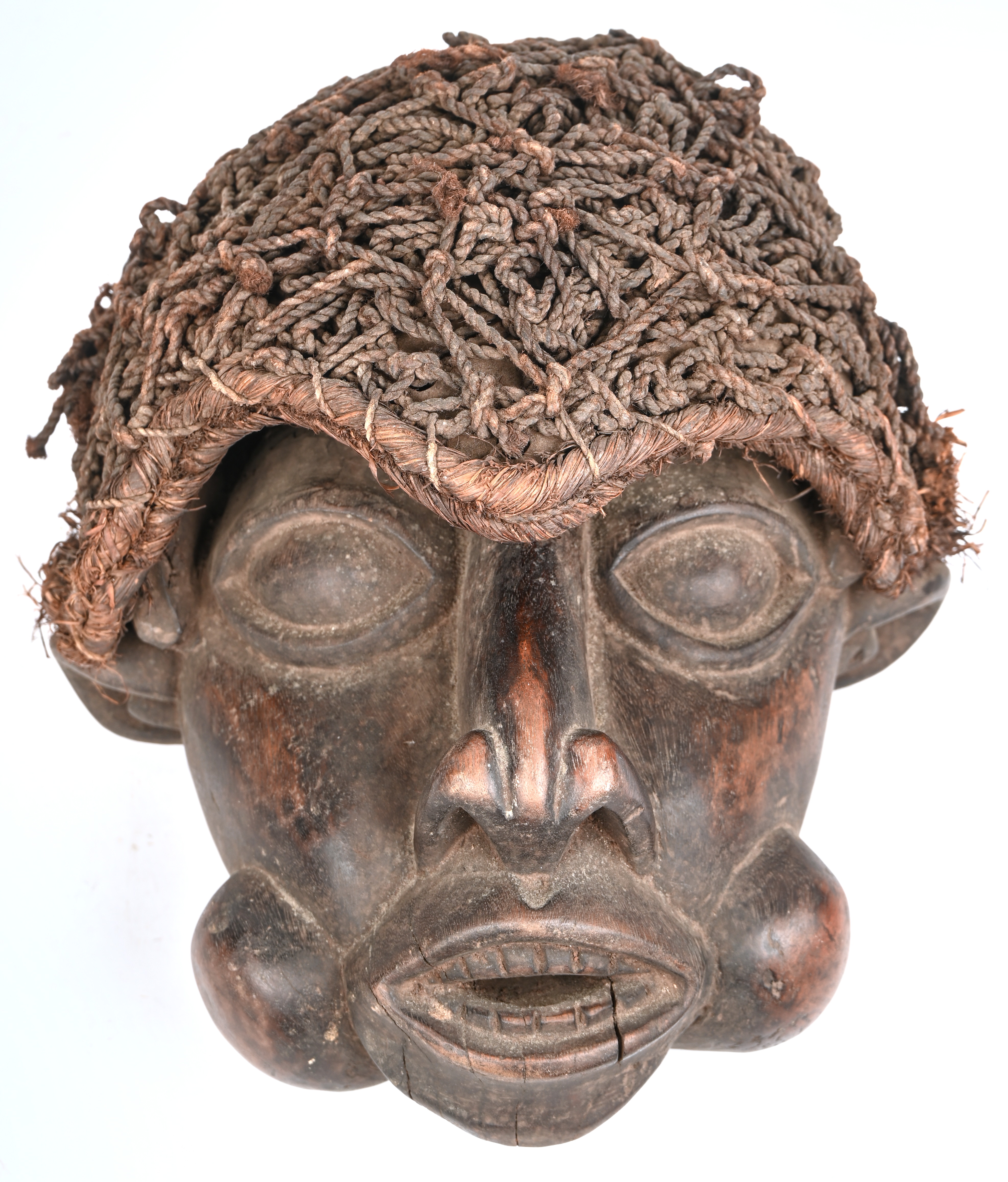 A large mask of carved wood with a beard and hair made of knotted rope. From Cameroon. -