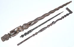 Three staffs of tribal chiefs made of carved wood. Tshokwé and Kwelé.