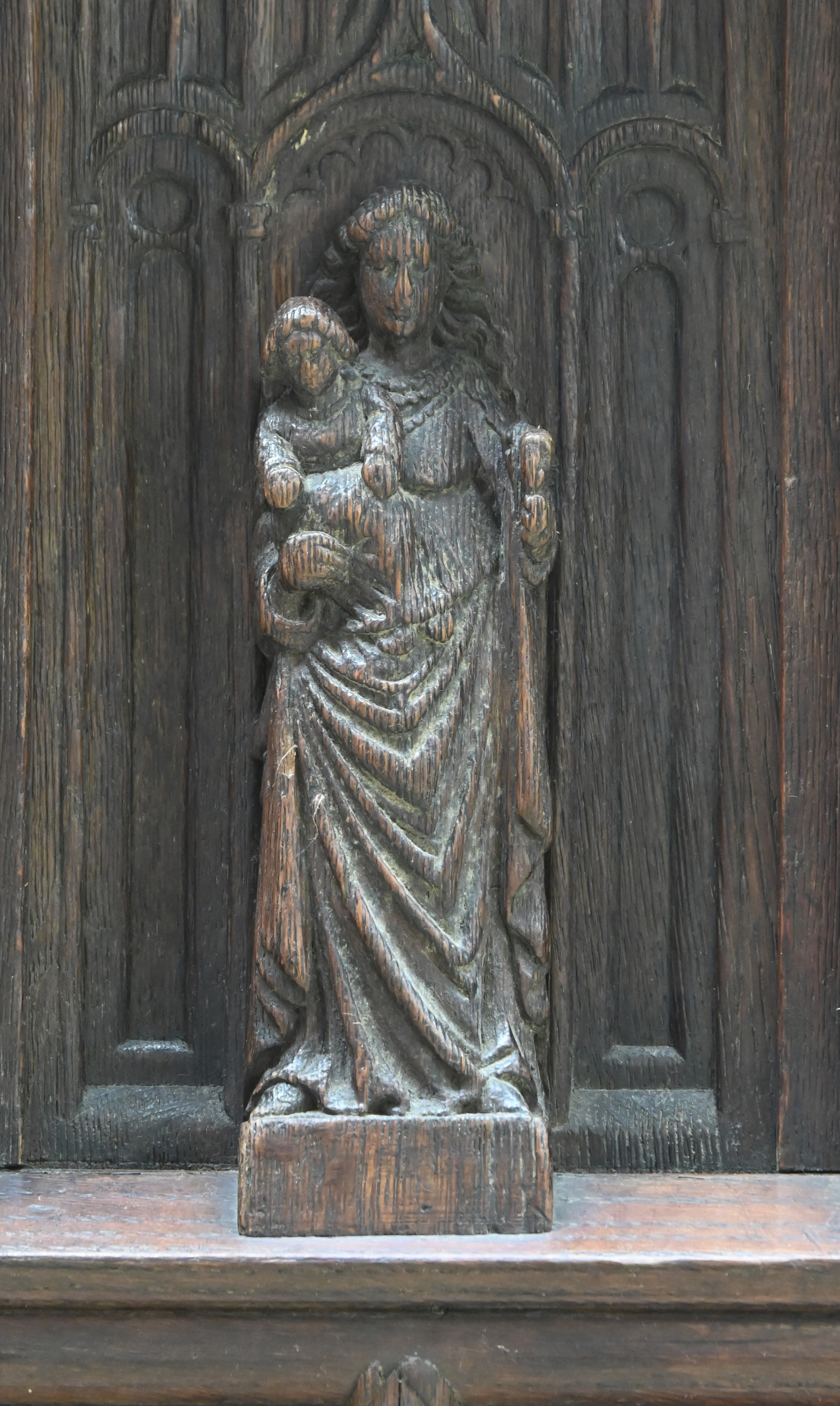 Een 18e eeuws gesculpteerd houten polychroom Mariabeeld, rechterhand manco.