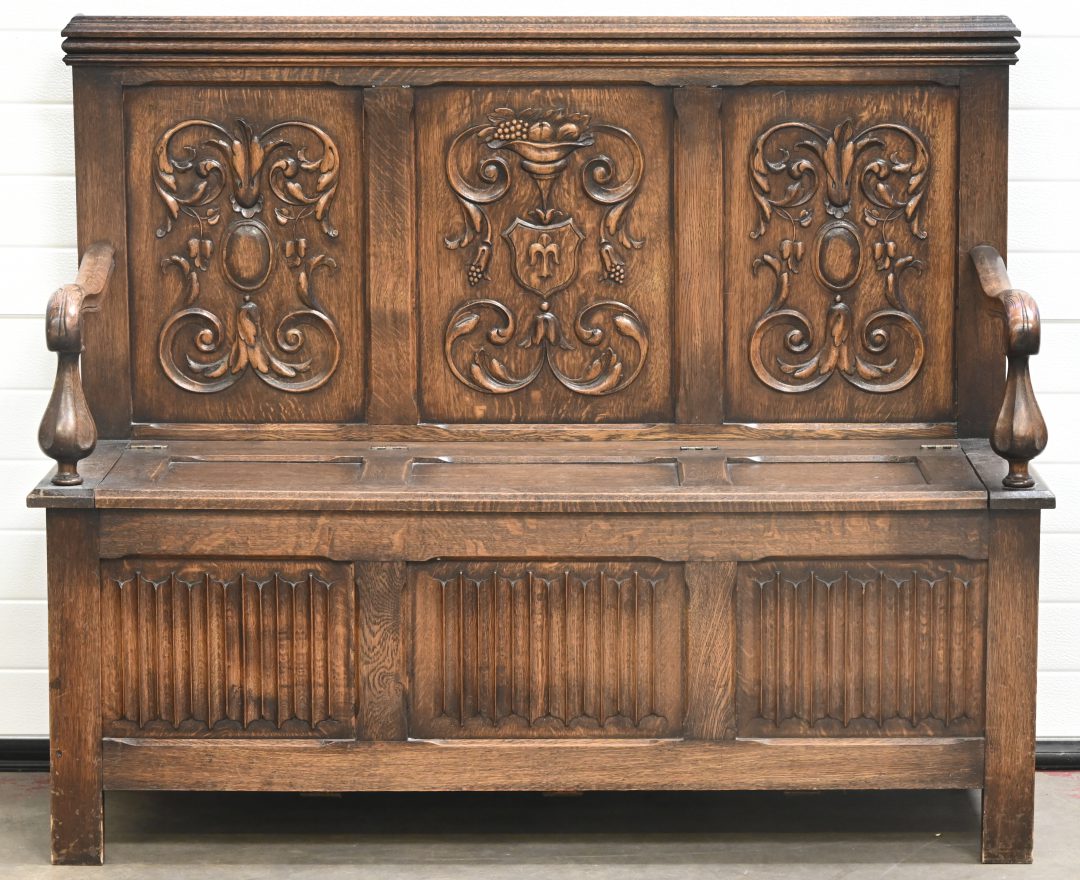 Een massief eikenhouten hallbank met gesculpteerde panelen.