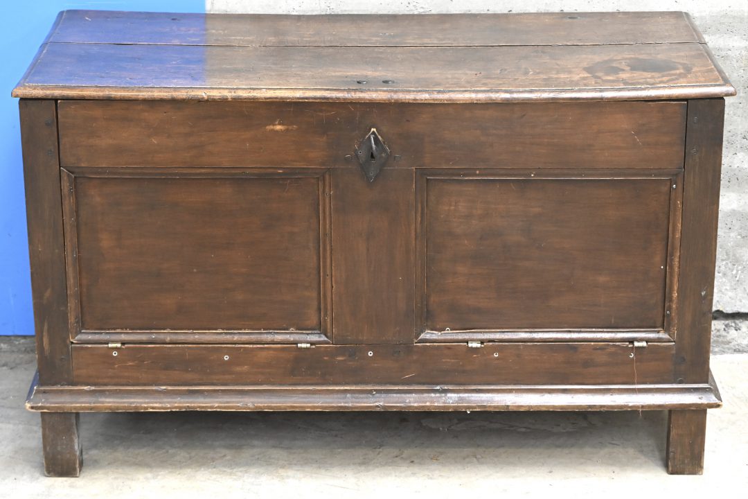 Een massief eikenhouten linnenkist.