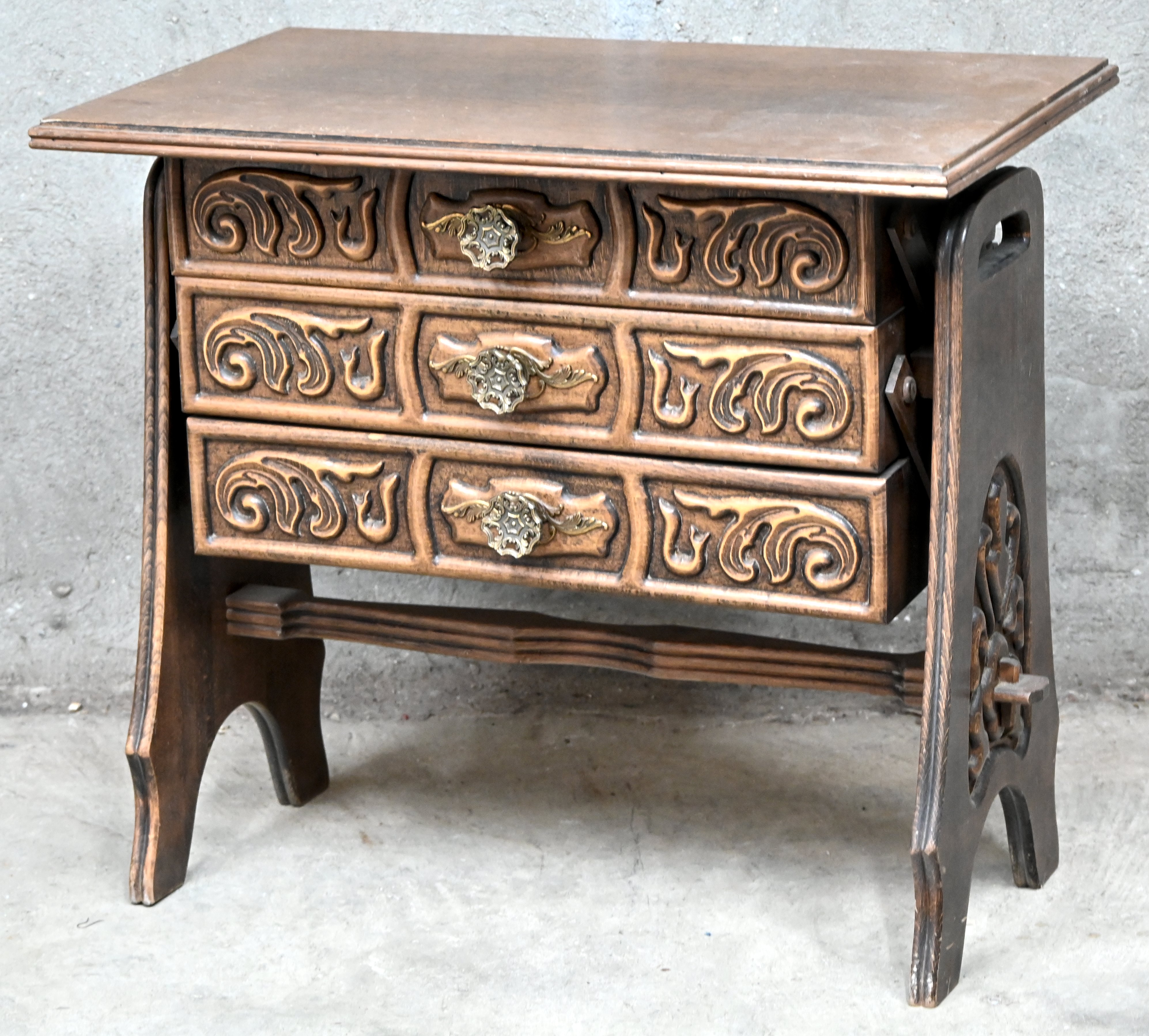 Een massief eikenhouten naaikistje met gesculpteerde delen.