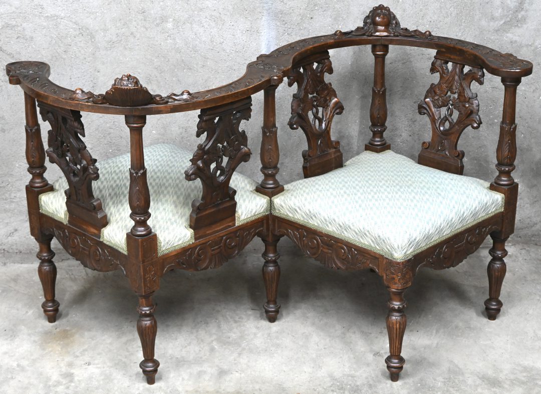 #106Een set van 2 clubzetels, gesculpteerd hout en roze fluwelen bekleding.
