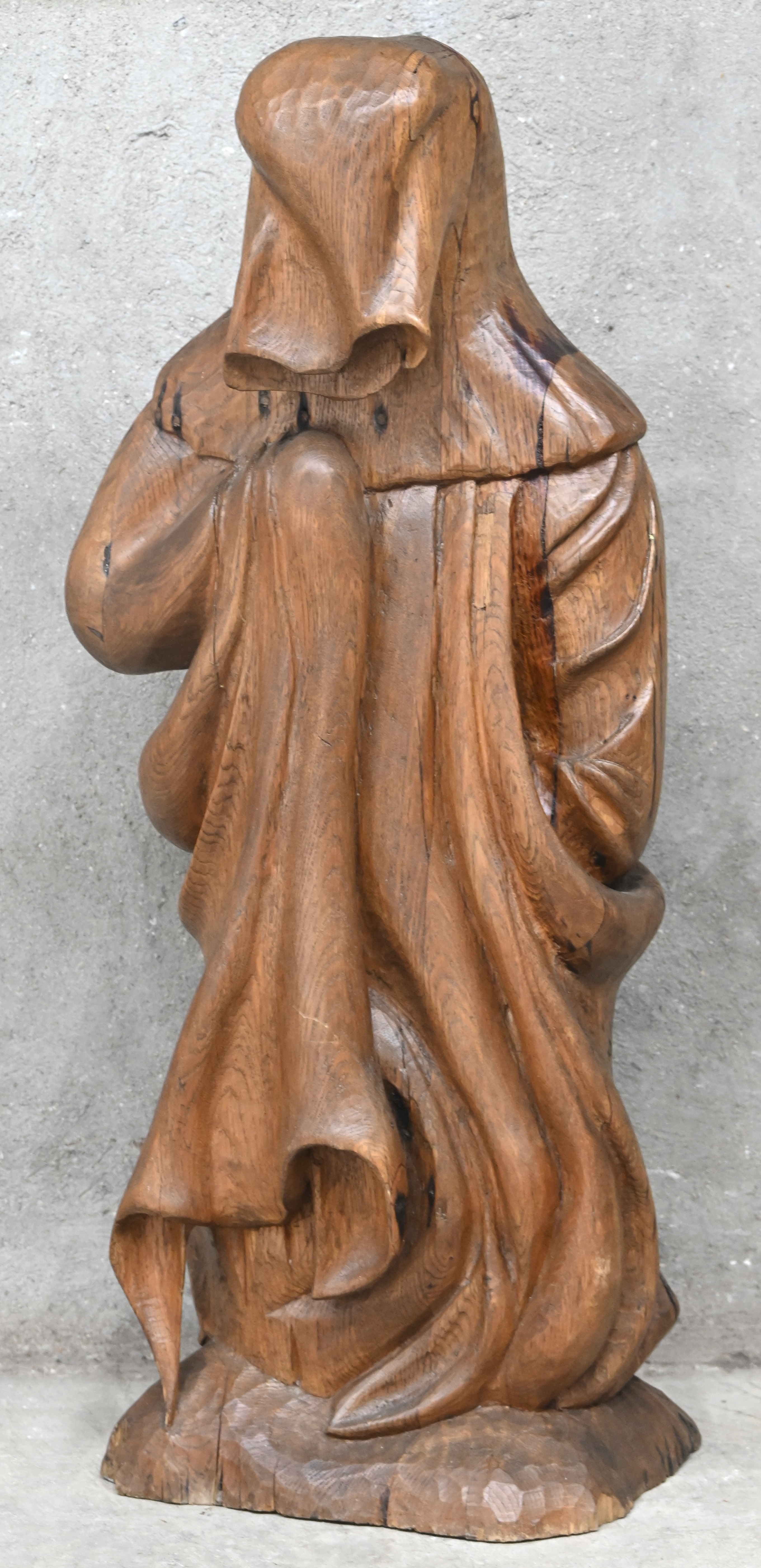 A solid wood figure of a mourner. Signed R. Van Riet.