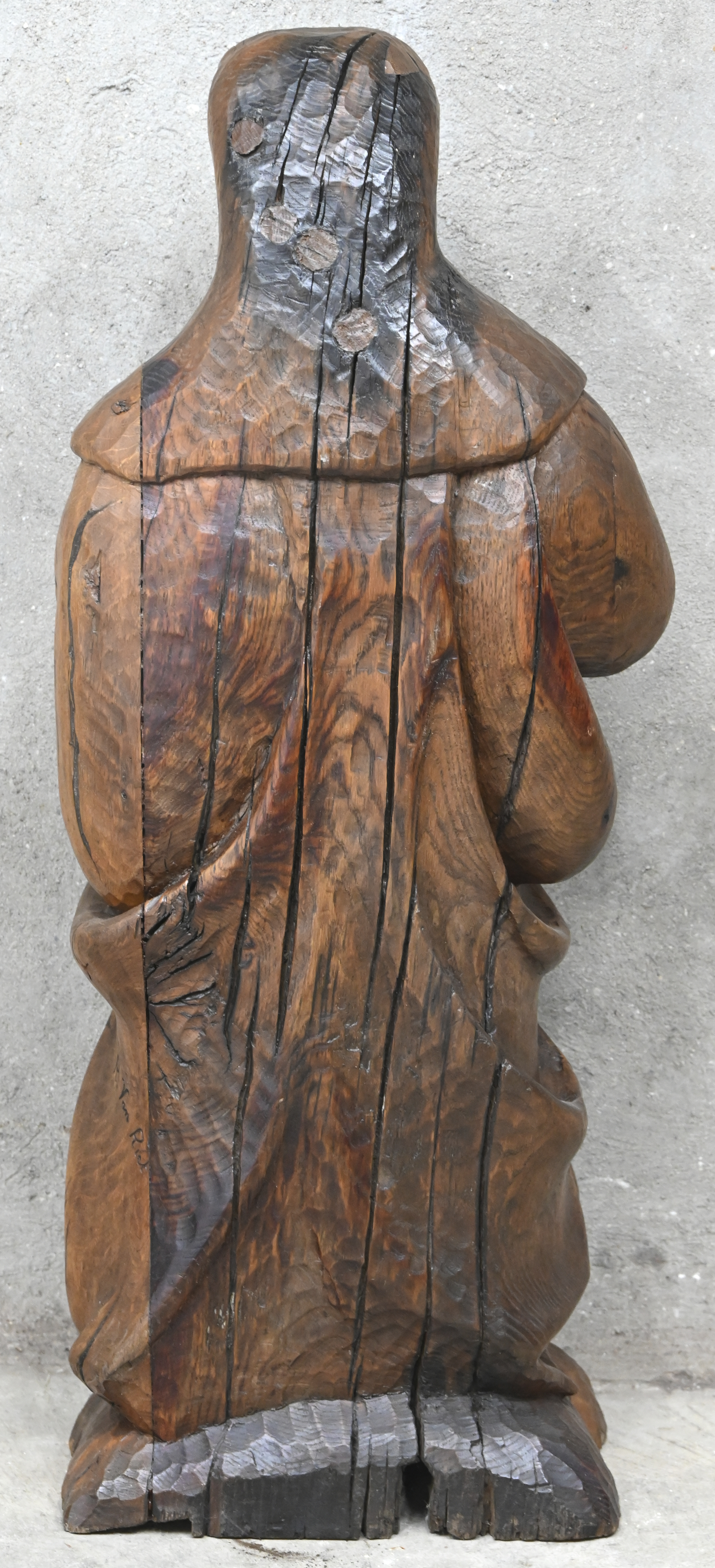 Een massief houten beeld van een pleurant. Getekend R. Van Riet.