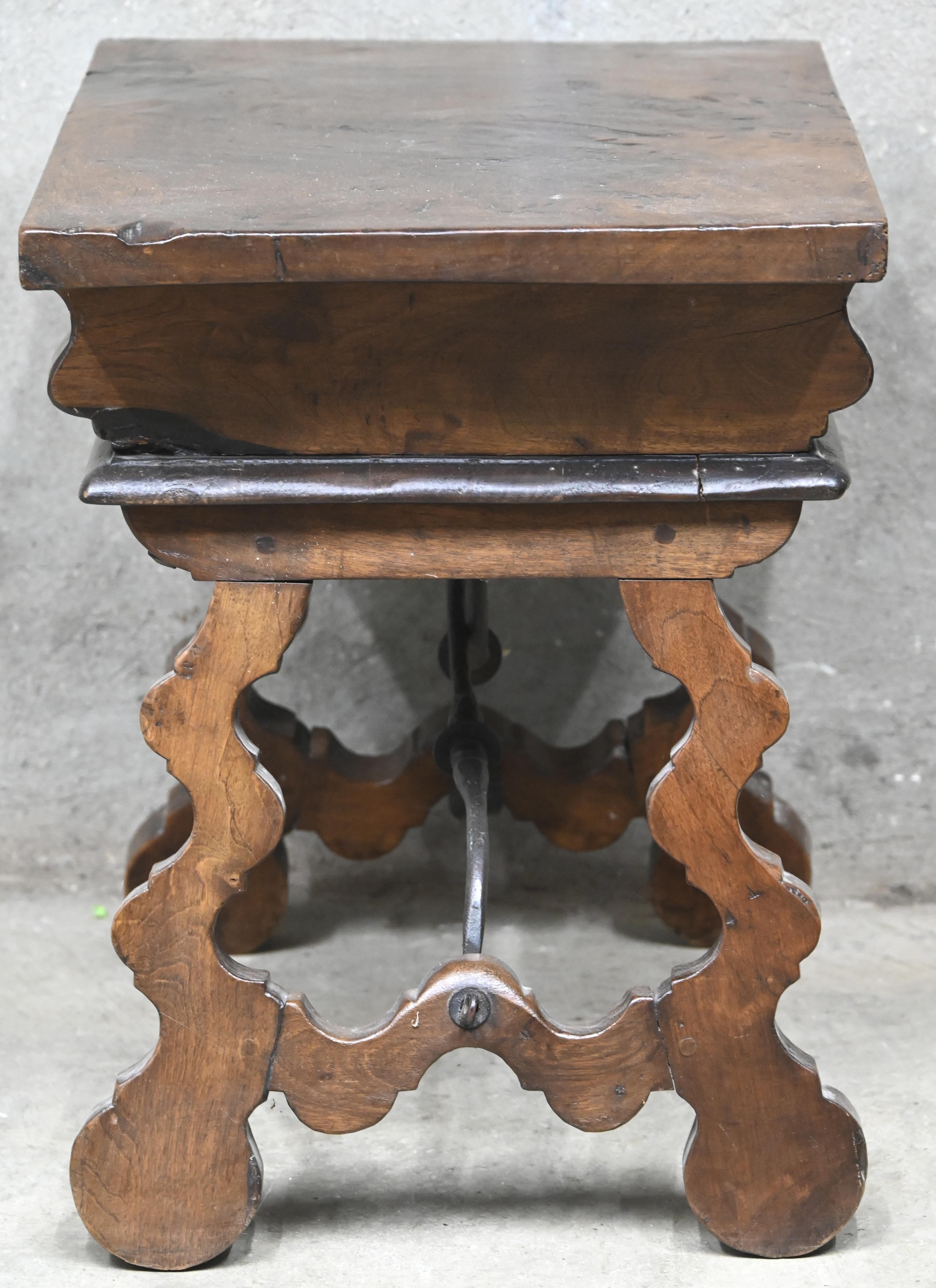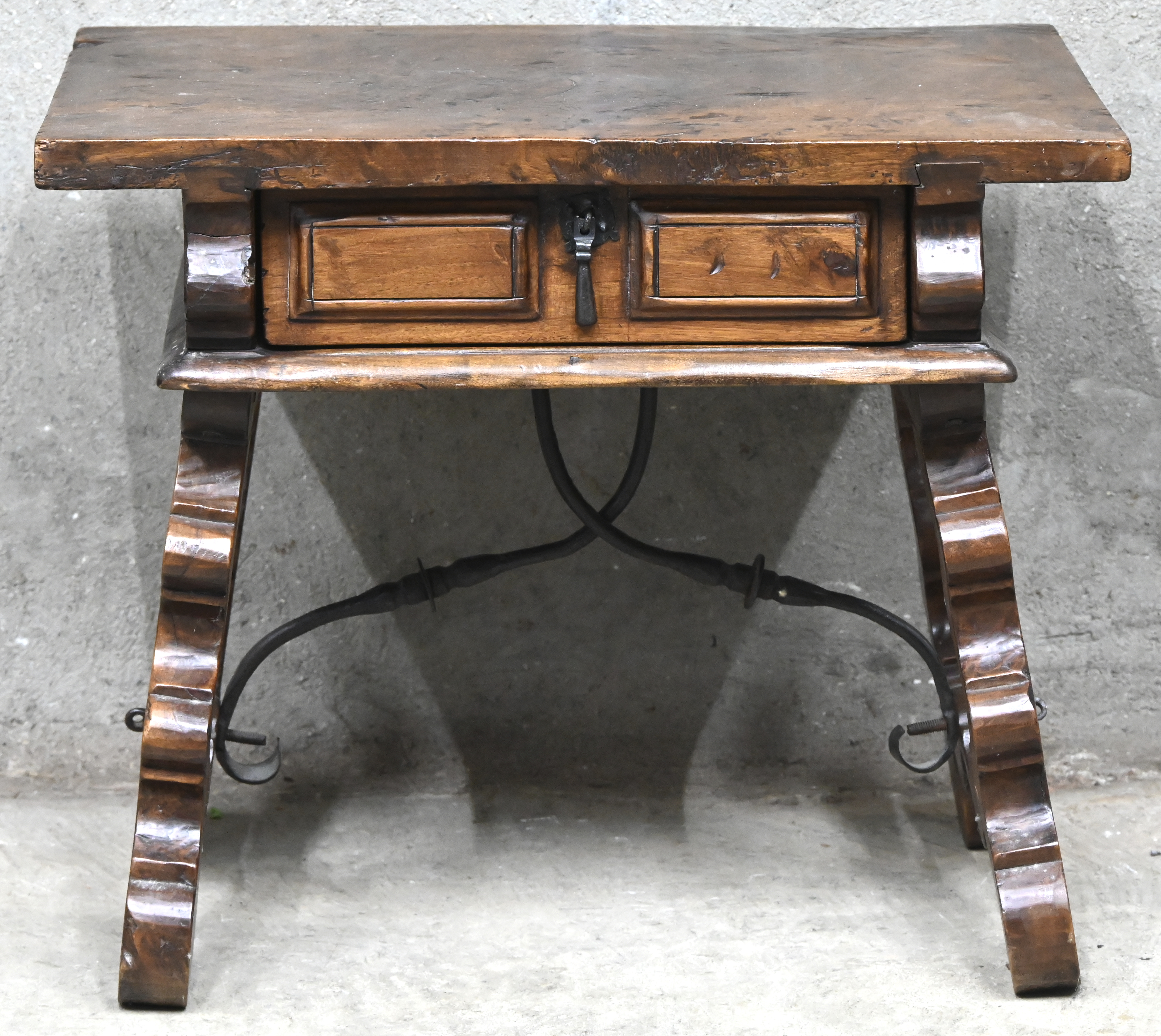 An antique side table with two drawers, a brass insert, and a wooden lid. Marquetry decoration. Some wear on the veneer. -
