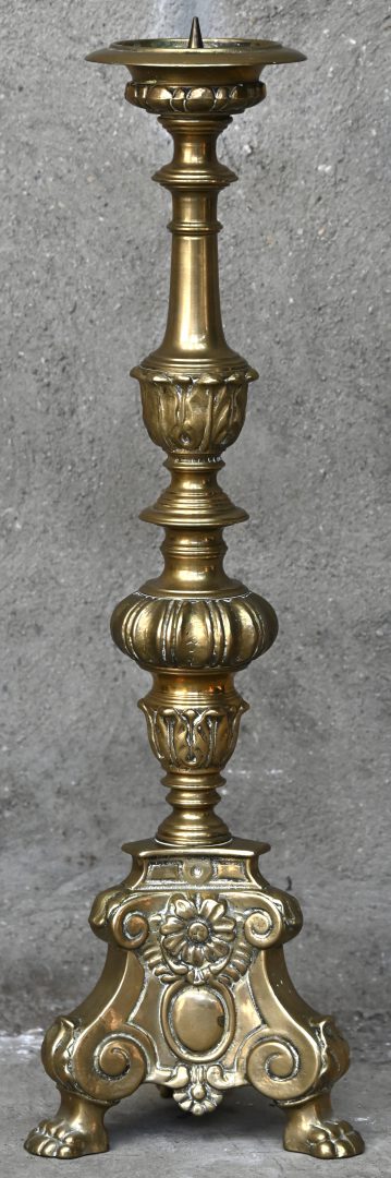 Een massieve messingen kerkkandelaar in barokke stijl. Driehoekig voetstuk op drie pootjes.
